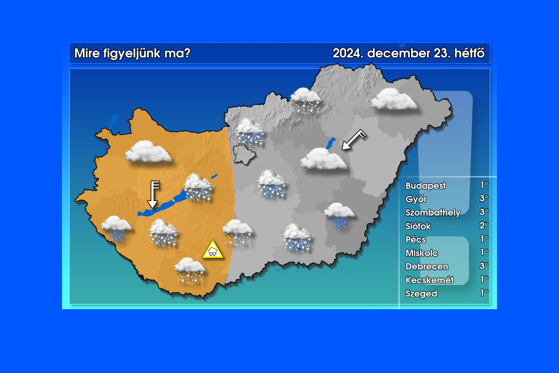Ma is marad az erősen felhős vagy borult idő. Főként a középső és déli országrészben számíthatunk csapadékra. A legtöbb helyen havas eső, havazás lesz, de ahol gyengébb intenzitású lesz a csapadék, ott eső is eshet (jellemzően a csapadékzóna keleti és nyugati szélén). Megmaradó hóra elsősorban a hegyekben számíthatunk, síkvidéken csak reggel, illetve késő délutántól, estétől lehet megmaradó hó. Ez általában lepel-3 cm olvadozó havat jelent, de Tolnában, Baranyában és Bács-Kiskun délnyugati részén 5-10 cm, a Mecsekben akár 15-20 cm körüli hóréteg is képződhet. Emellett az északi szél a Dunántúlon megerősödik, amit időnként – főként a nyugati részein – viharos lökések is kísérhetnek. Elsősorban a Mecsekben késő délutántól hófúvás is előfordulhat – írta közösségi oldalán a HungaroMet.
