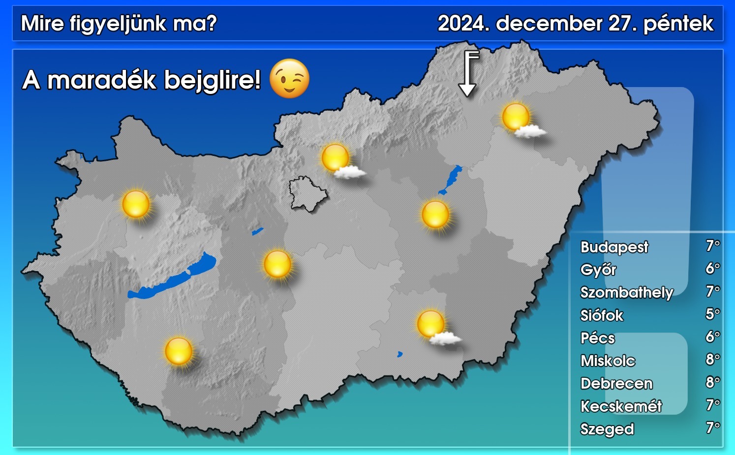 A pára és ködfoltok feloszlását követően ma is folytatódik a nagyrészt derült, napos időjárás. A keleti, északkeleti országrészben fordulhatnak elő olykor felhősebb tájak és periódusok, de csapadék nem várható. A légmozgás döntően gyenge vagy mérsékelt marad, csak az északkeleti tájakon élénkülhet meg az északias szél, amit Zemplén térségében olykor erős lökések kísérhetnek. A csúcsérték 4 és 10 fok között valószínű – közölte a HungaroMet NZrt.