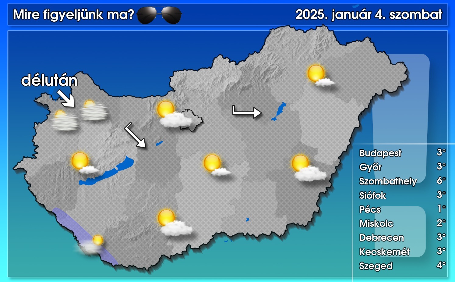 Ma általában gyengén felhős, napos idő várható, de helyenként előfordulhatnak közepesen vagy erősen felhős időszakok. Továbbá a délnyugati tájakon maradhatnak tartósabban rétegfelhős, ködös körzetek. Emellett a délutáni óráktól északnyugat felől elkezd megnövekedni a fátyolfelhőzet, ami akár szűrheti a nap fényét. A nyugatias szél élénk lesz, majd délutánra mérséklődik, és délire fordul a légmozgás. Délután nagyrészt 3, 4 fok körüli értéket mérhetünk, de elsősorban a tartósabban ködös tájakon hidegebb maradhat az idő – közölte a HungaroMet NZrt.