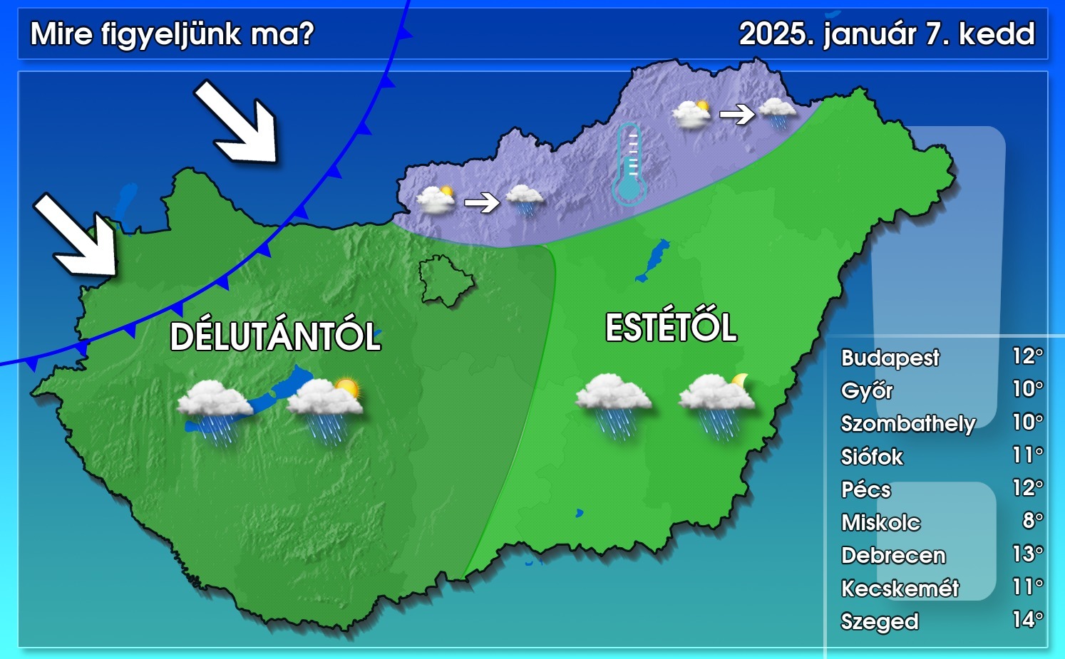 Ma is tavaszias idő lesz az ország nagy részén 10 fok fölötti csúcsértékekkel (délen a hőmérséklet akár a 15 fokot is meghaladhatja néhol). Az Északi-középhegység térségében lehet a legkevésbé érezni a tavaszt, arrafelé nagyobb területen is párás, borult maradhat az idő, és változatlanul jócskán elmaradhat a maximum az ország többi részéhez képest. Másutt reggel, délelőtt gyakran változik a felhőkép, majd délután északnyugat felől hidegfront felhő- és csapadékzónája érkezik, így ebből az irányból záródik a felhőtakaró, és egyre többfelé elered az eső (az Alpokalján és a Bakonyban nem kizárt halmazállapotváltás). A csapadékzóna az esti órákban, várhatóan gyengülve éri el a délkeleti, keleti országrészt. Ismét többfelé megélénkül, néhol megerősödik a déli szél, amely a délutántól fölöttünk délkelet felé vonuló front mentén északnyugatira fordul.