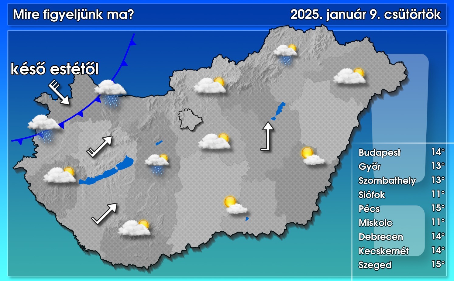 Ma a változó felhőzet mellett helyenként előfordulhat kisebb eső, záporeső , de az ország nagy részén napközben még száraz idő várható. A déli, délnyugati szél többfelé megélénkül, főként az Észak-Dunántúlon átmenetileg erős, néhol viharos lökések is lehetnek. A csúcsérték még mindig tavaszias tartományban fog majd mozogni, nagyrészt 10 és 15 fok közötti értékeket mérhetünk, csak az északi határnál lehet ennél több fokkal hidegebb. Késő estétől északnyugat felől hidegfront érkezik, emiatt beborul az ég, és egyre többfelé várható eső, zápor, amit a következő éjszakán havas eső, hó is felválthat. A front mentén, illetve mögötte az északnyugatira forduló szél megerősödik, viharossá fokozódik.