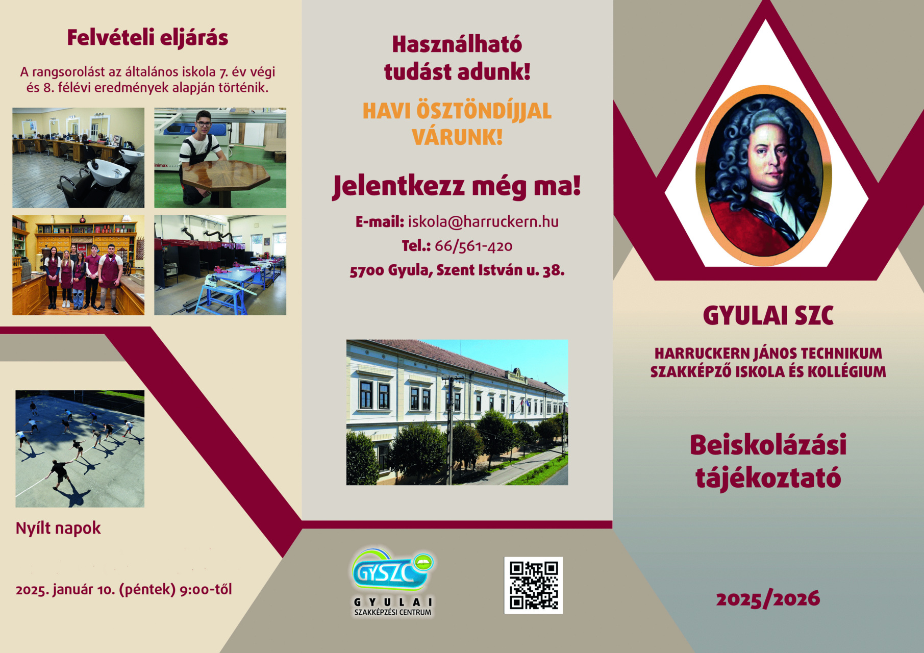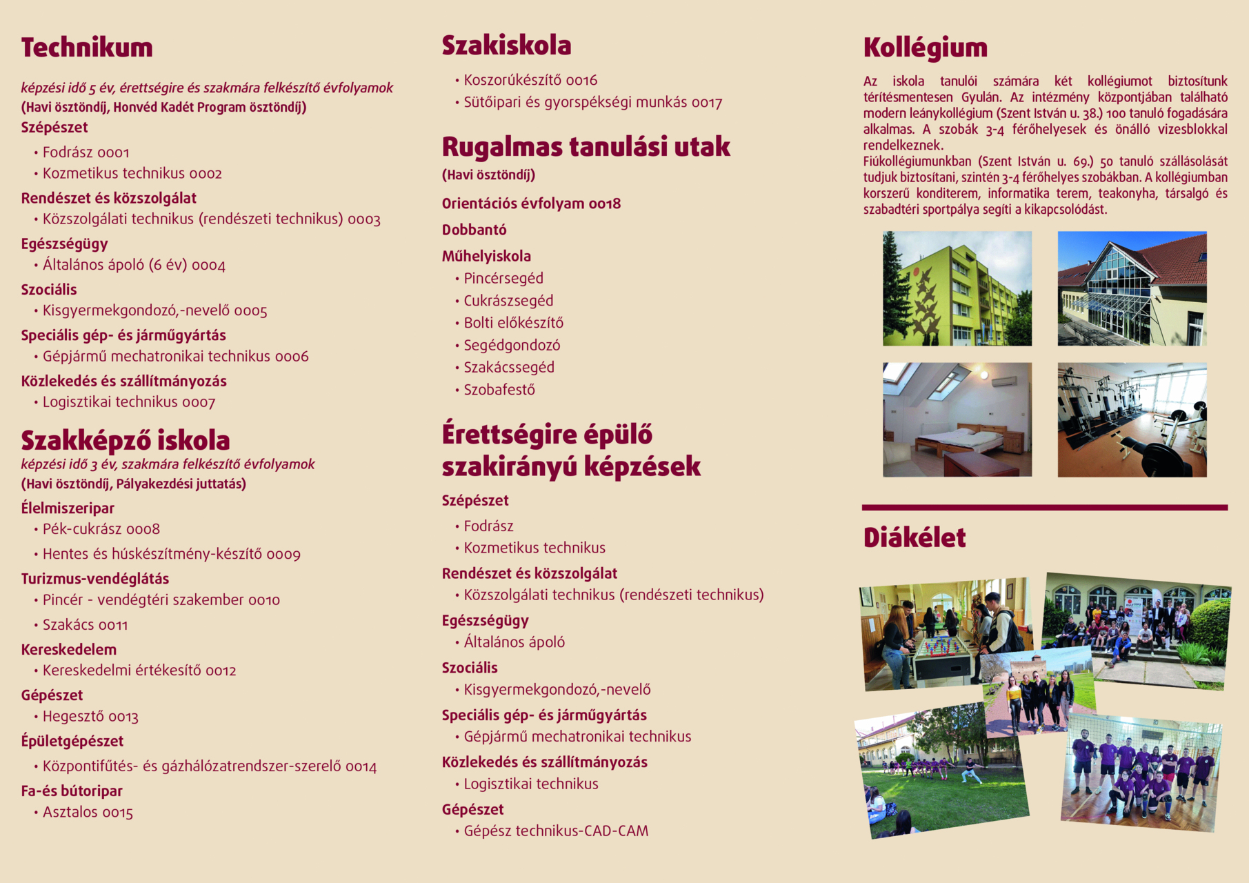Technikumi, szakképző iskolai, szakiskolai és érettségire épülő szakirányú képzésekkel várja a diákokat a Gyulai Szakképzési Centrum Harruckern János-középiskolája.