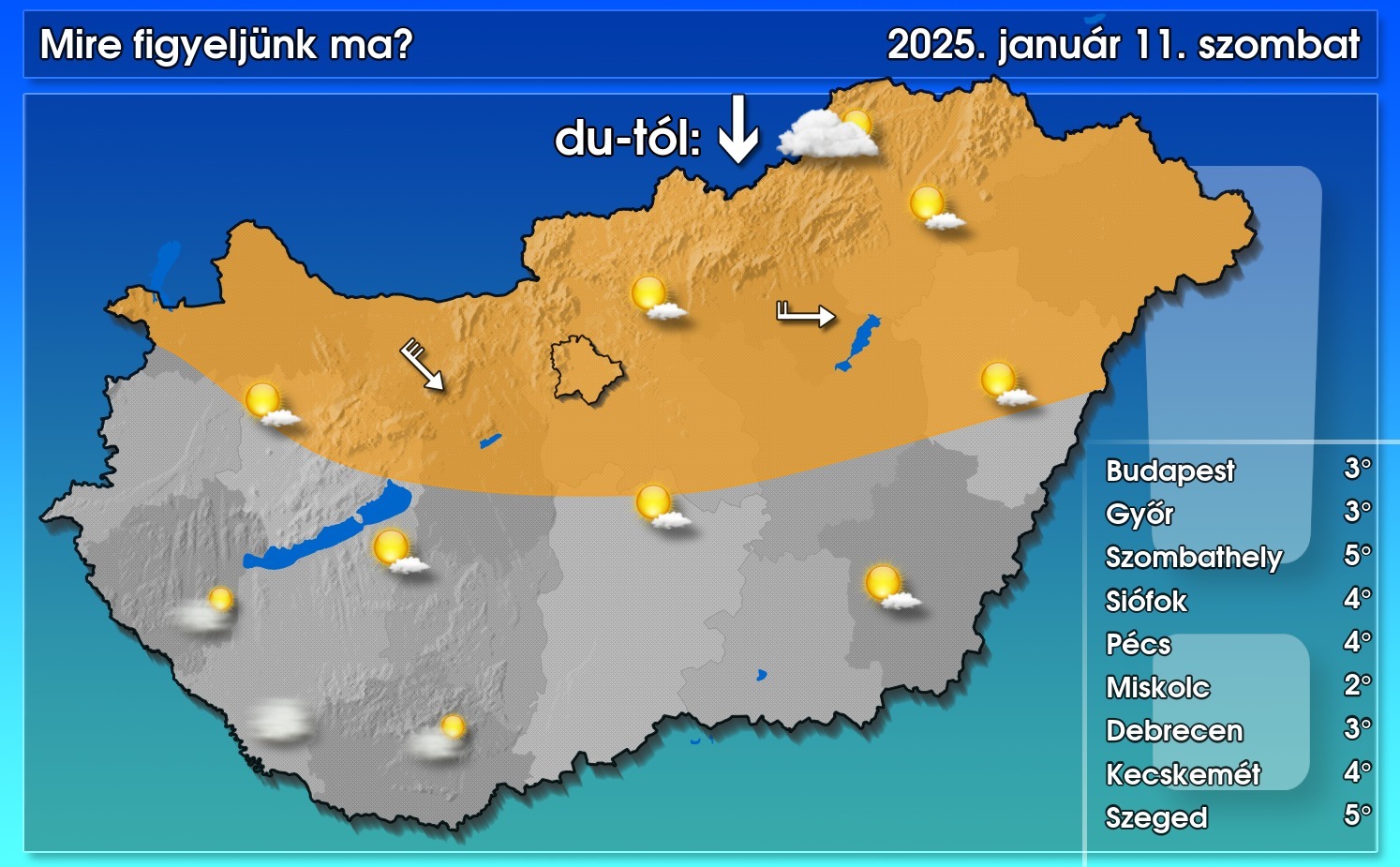 Hazánk nagyobb részén sok napsütés várható, nagyrészt 3, 4 fok körüli maximumokkal, megélénkülő, helyenként megerősödő széllel. A délnyugati tájakon azonban gyengébb marad a légmozgás, így a reggelre képződött köd egy része napközben is tartósan megmaradhat. Délután az északkeleti-északi harmad fölé vastagabb felhők sodródhatnak, ott néhol hózápor is lehet – közölte a HungaroMet NZrt.