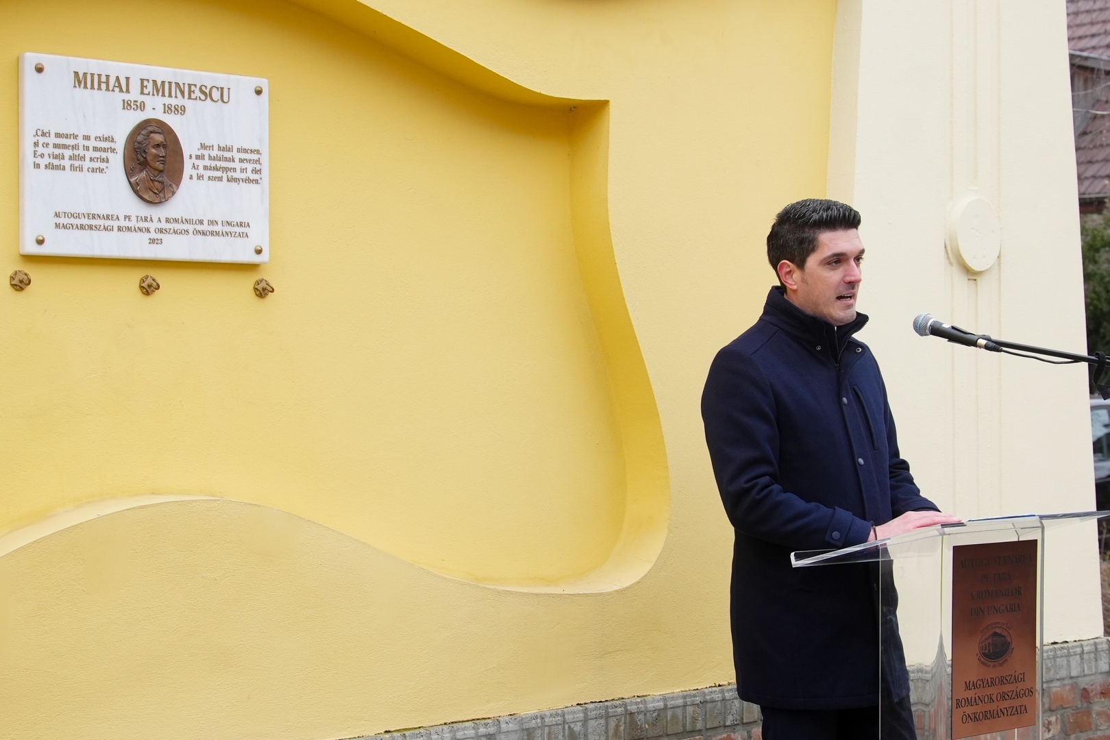 Kozma György, az MROÖ elnöke beszédében felidézte: harmadik alkalommal emlékeznek meg „a román költészet géniuszáról” 2023-ban állított emléktáblájánál, amely olyan „szellemi hídnak” tekinthető a román közösség számára, amely összeköti a múltat a jelennel, és azt a küldetést is szimbolizálja, hogy megőrizzék értékeiket a jövő számára.