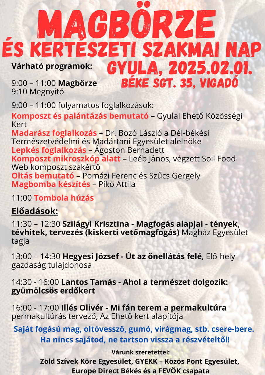 A kapunyitás 8.50-kor lesz, a megnyitót 9 órától, a mag- és oltóvessző-csereberét 9.15-től 11 óráig tartják. A szervezők azt kérik, a látogatók saját fogású, nem hibrid magokat vigyenek az eseményre. Szaporító anyagokból, gumókból, oltóvesszőkből bármit szívesen fogadnak.