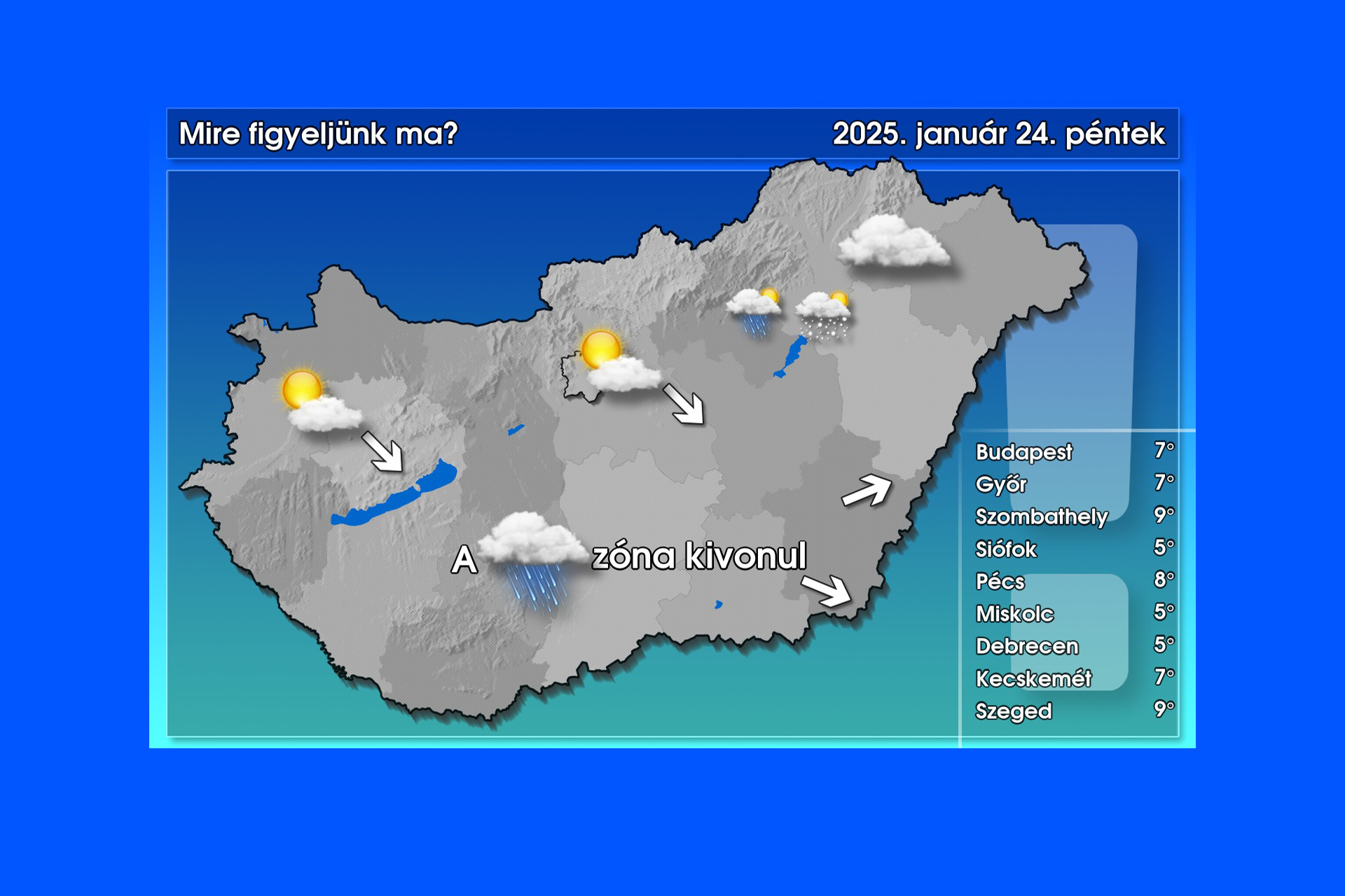 Most még a déli tájakon esik az eső, de az összefüggő felhő- és csapadékrendszer a nap során délkelet, kelet felé fokozatosan elhagyja hazánkat, mögötte kisüt a nap. Északkeleten azonban tartósabban zártabb maradhat a felhőzet, délután főleg arrafelé van esélye zápornak, esetleg hózápornak. A csúcshőmérséklet 3 és 11 fok között alakul. Északkeletről délnyugat felé haladva melegszik a levegő.