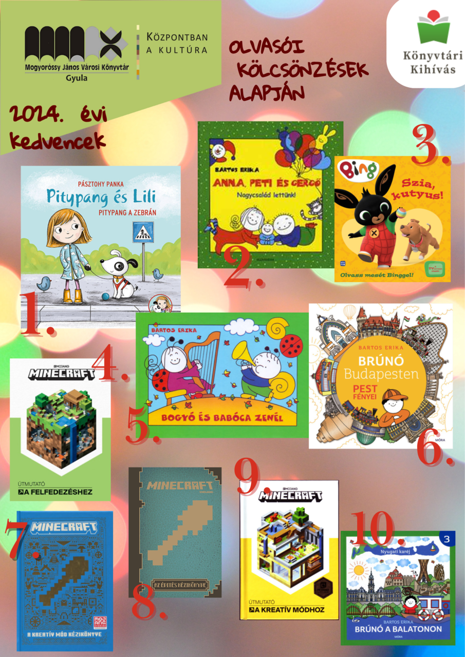 Mint írta, a gyermekkönyvek között Pásztohy Panka Pitypang és Lili című kötete végzett, amelyet összesen 65 alkalommal kölcsönöztek ki tavaly. Bartos Erika Anna, Peti és Gergő című könyve végzett a második helyen, a dobogóra még Bing nyuszi egyik története fért fel. Kiemelte: töretlen a Minecraft videójáték népszerűsége, a top 10-be négy ilyen témájú kötet került be.