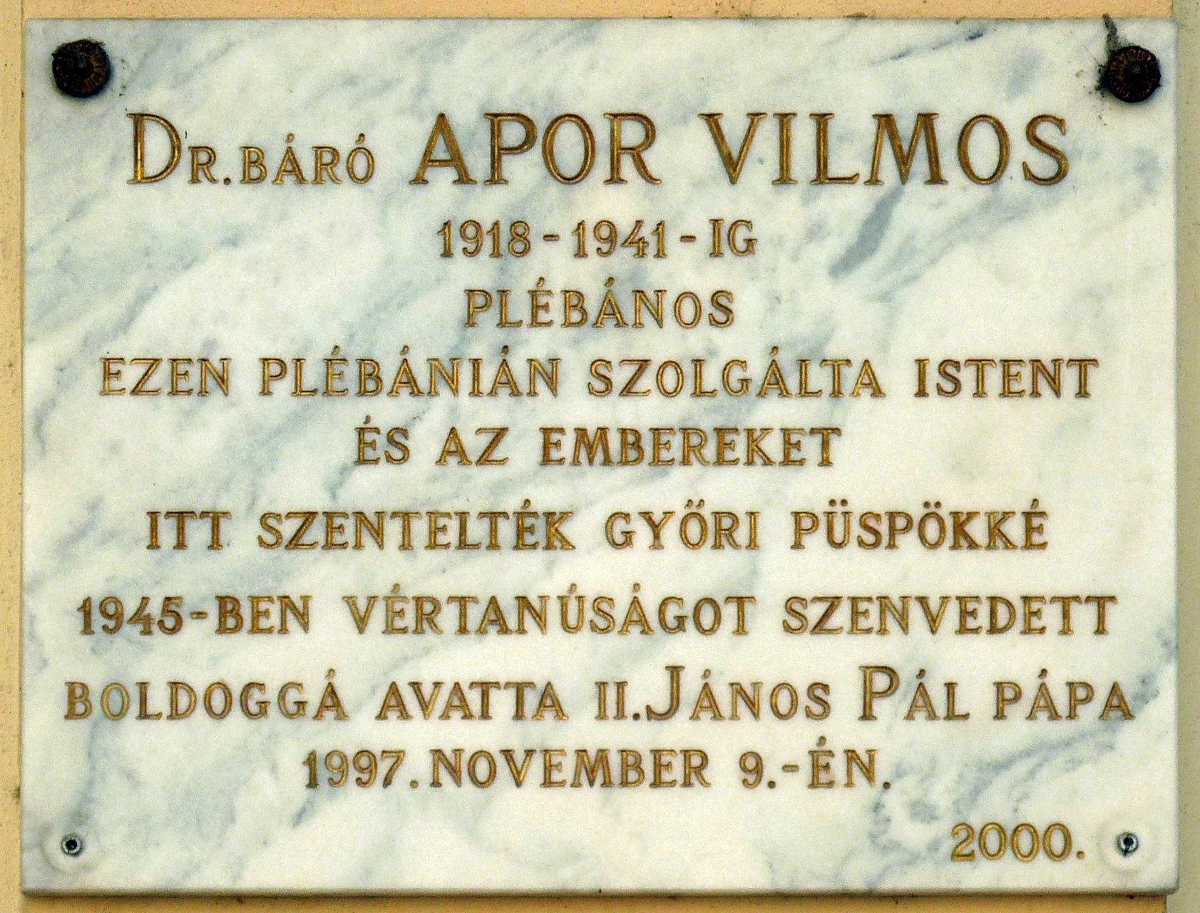 25 évvel ezelőtt, 2000. február 29-én ünnepélyesen elhelyezték a plébánia épületének falán az Apor-emléktáblát. Beszédet dr. Mánya Tibor, az Apor Vilmos Emlékbizottság gyulai szervezetének elnöke mondott.