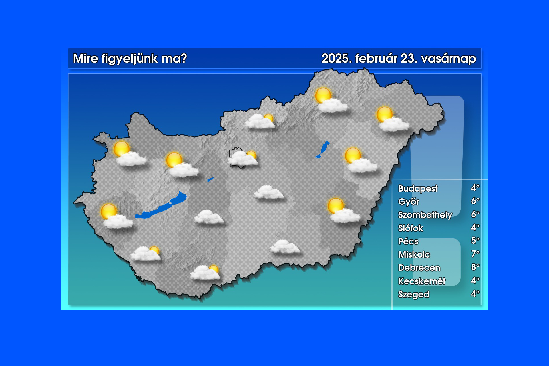 A középső országrészben lesz több a felhő, a Dunántúl északnyugati részén valamint a keleti, északkeleti tájakon jóval többet süt a nap. A felhős részeken előfordulhat kis mennyiségű vegyes halmazállapotú csapadék. A csúcshőmérséklet 3 és 9 fok között alakul – írta közösségi oldalán a HungaroMet.