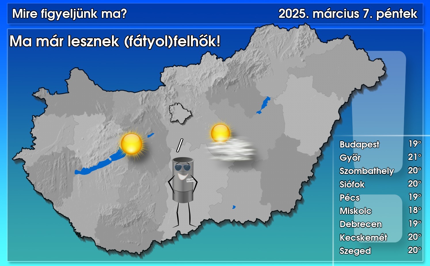 Ma már fátyolfelhők is lesznek felettünk, ennél nagyobb változásra ne számítsunk. A pára- és ködfoltok gyors elillanása után folytatódik a nyugodt, tavaszi idő, április végén jellemző, 20 fok körüli maximumokkal. Az Észak-Dunántúlon időnként megélénkül a déli, délkeleti szél – közölte a HungaroMet NZrt.