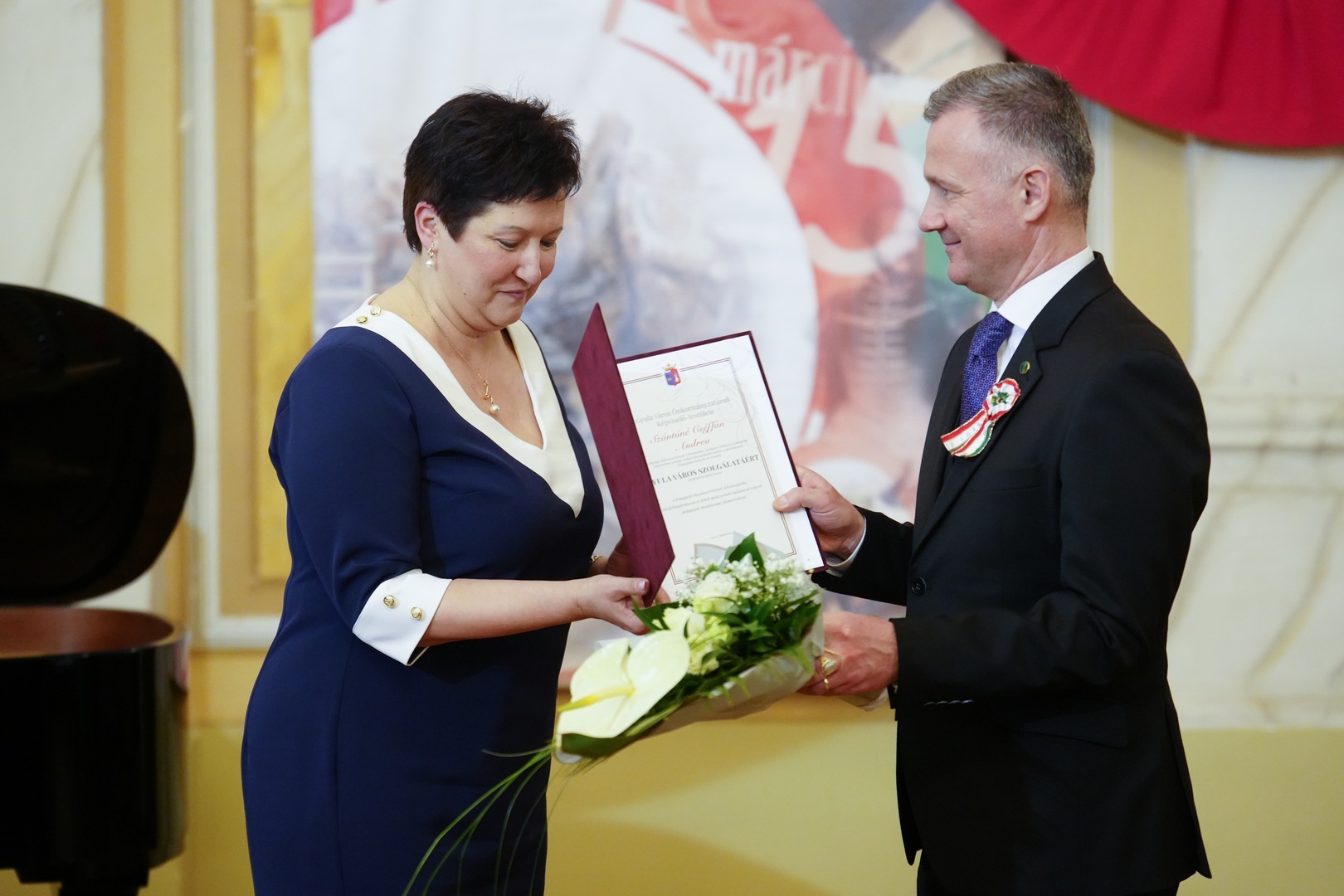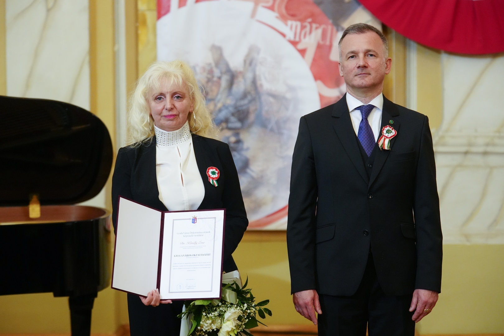 Gyula Város Szolgálatáért kitüntetést vehetett át Szántóné Cséffán Andrea, a Nicolae Bălcescu Román Gimnázium, Általános Iskola és Kollégium történelem–román szakos középiskolai tanára, a gimnázium főigazgató-helyettese kimagasló hivatásszeretettel, felelősségteljes intellektualizmussal és fejlett módszertani kultúrával végzett pedagógiai munkájáért.