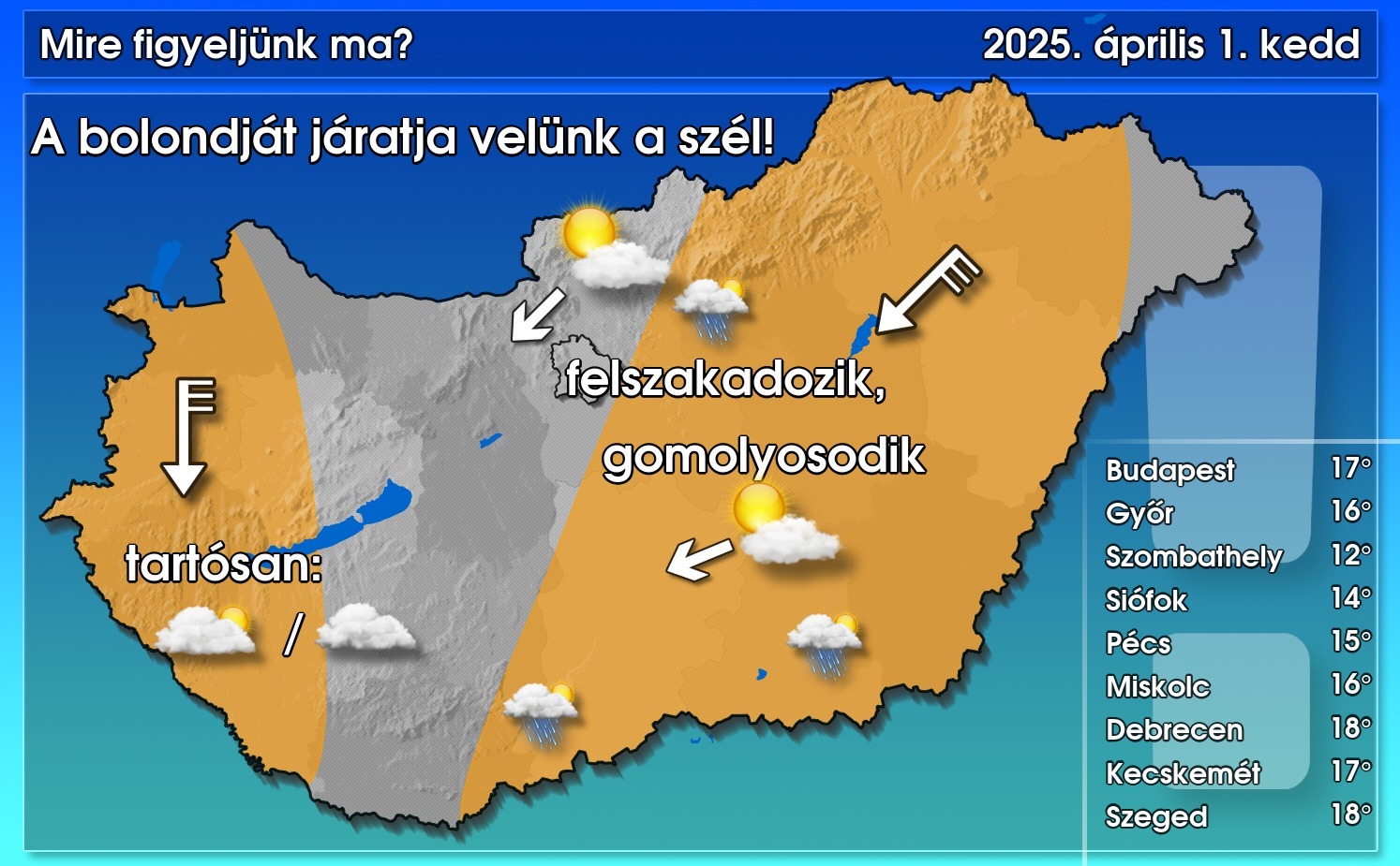 Ma is szeles nap elé nézünk, a Nyugat-Dunántúl mellett most már a keleti országrészben is nagy területen megerősödik, néhol viharossá fokozódik az északi, északkeleti szél. Ezzel párhuzamosan viszont felszakadozik, gomolyosodik a felhőzet, legtovább felhős tájak délnyugaton, nyugaton maradhatnak. A gomolyokból helyenként – elsősorban a déli tájakon – futó záporok előfordulhatnak, délkeleten zivatar sem kizárt. A hőmérséklet csúcsértéke 12 és 19 fok között alakul, a naposabb keleti tájakon lesz a melegebb.