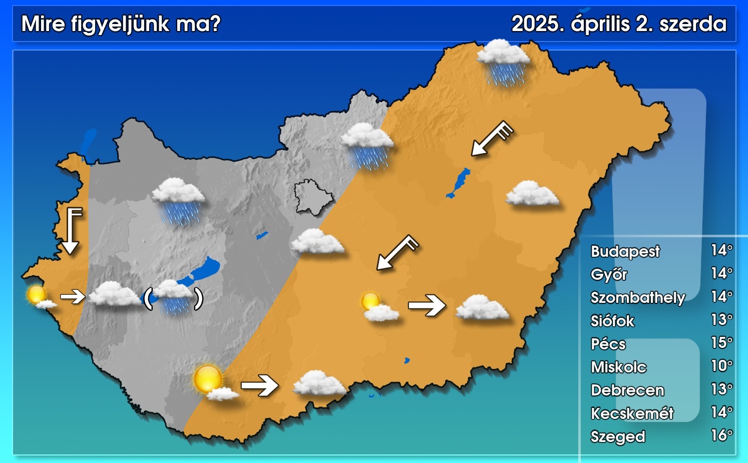 Északkelet felől egyre többfelé erősen megnövekszik a felhőzet, beborul az ég, de a délelőtti órákban főként a déli, délnyugati tájakon hosszabb-rövidebb napsütésre is számíthatnak az ott élők. Eső, zápor napközben inkább hazánk északi, majd késő délutántól egyre inkább a nyugati felén fordulhat elő. Az északi, északkeleti szél a sárgával jelölt tájakon ismét megerősödik, északkeleten néhol viharos közeli lökések is lehetnek. A csúcshőmérséklet 10 és 17 fok között valószínű, a déli tájakon kúszik magasabbra a hőmérő – közölte a Hungaromet NZrt.