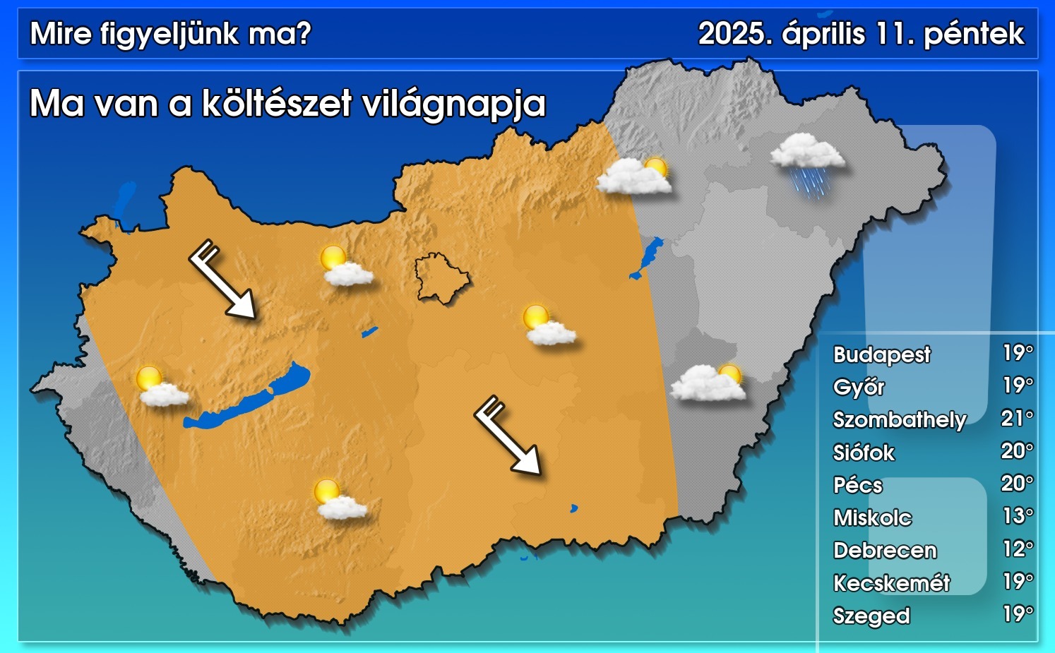 Ma van a költészet napja, amelyen időjárásunkról az erős szél mesél nekünk susogó, süvítő hangján . Nyugaton a fátyolfelhőkön átszűrődő napfény ragyogását és simogató melegét érezhetjük, míg keleten a sötét fellegek és az időszakos eső csendes kopogása formálhatja meg a nap ritmusát. Ezt az időjárási kettősséget saját bőrünkön is érezhetjük, ugyanis nyugaton a 20 fokos tavasz hívogató melegét tapasztalhatjuk, míg ezt a melegséget hiányolhatjuk a keleti hűvös levegőben.