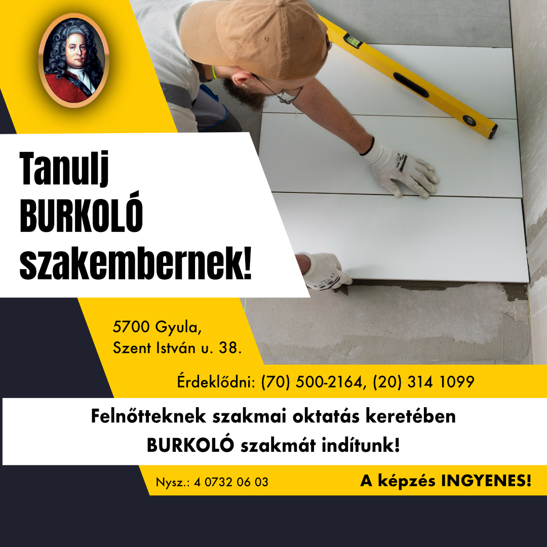 Kétkezi munka, stabil jövő! Ha szereted a precíz munkát és szívesen dolgozol látványos eredményekért, a burkoló szakma Neked való. Tanuld ki 12 hónap alatt, és szerezz keresett szakmát már 2025 őszétől! Jelentkezés folyamatosan!