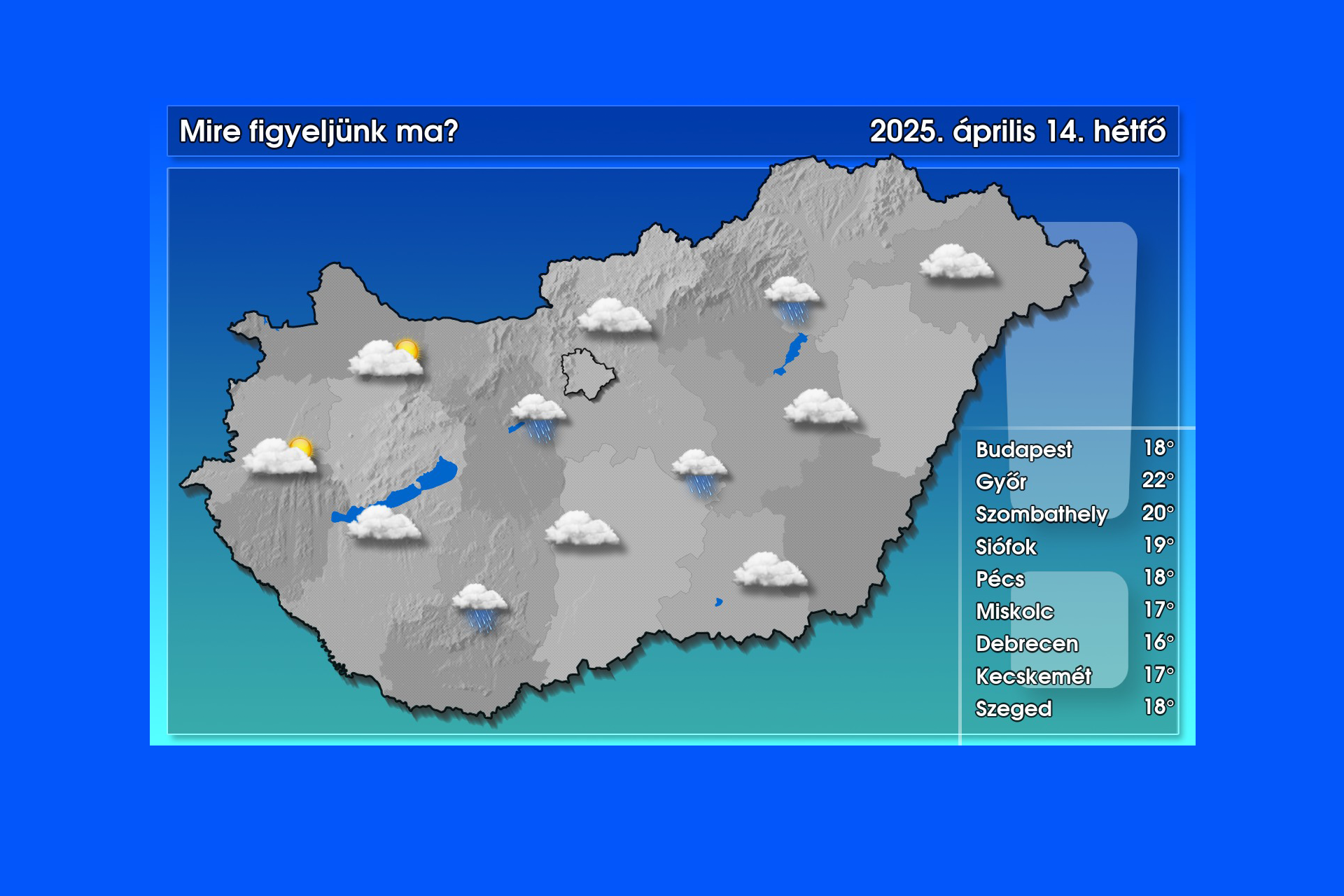 Ma már csak az északnyugati tájakon fordulhat elő (szűrt) napsütés, arrafelé a csúcsérték is magasabban, nagyrészt 20 fok körül, vagy a fölött valószínű. Máshol a vastag felhőzetből elszórtan előfordulhat poros eső, záporeső, a maximum pedig 13 és 19, 20 fok között alakul. Északkeleten várható a leghűvösebb. A délies szelet élénk, néhol erős lökések kísérhetik.