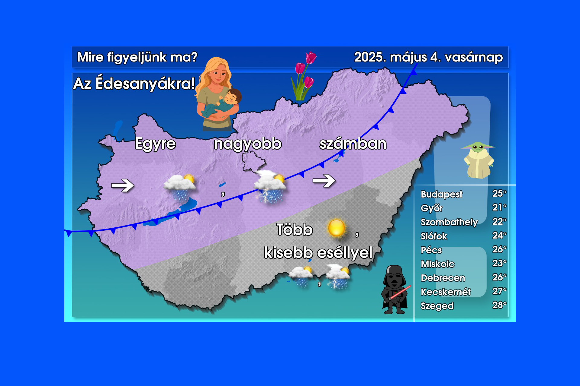 Anyák napján – egyben a Star Wars világnapján – már mozgalmasabb időre számíthatunk, ugyanis hullámzó hidegfront helyeződik fölénk: hatására ma már jóval erőteljesebb lesz a gomolyfelhő-képződés, és főleg a lilával jelölt területen egyre több nyugatról kelet felé mozgó záporos, zivataros góc jelenhet meg. Ezek kialakulási esélye a déli, délkeleti országrészben a legkisebb, arrafelé van kilátás a legtöbb napsütésre, és a magasabb (egyes helyeken még mindig 30 fokot közelítő) csúcsértékekre. Eközben a tartósabban felhős északi, északi tájakon a korábbi napokhoz képest már jóval alacsonyabb maximumokra lehet készülni. A délnyugati, majd egyre többfelé északnyugatira forduló szél többfelé megélénkül, helyenként megerősödik – zivatarok környezetében átmenetileg viharos széllökések is előfordulhatnak.