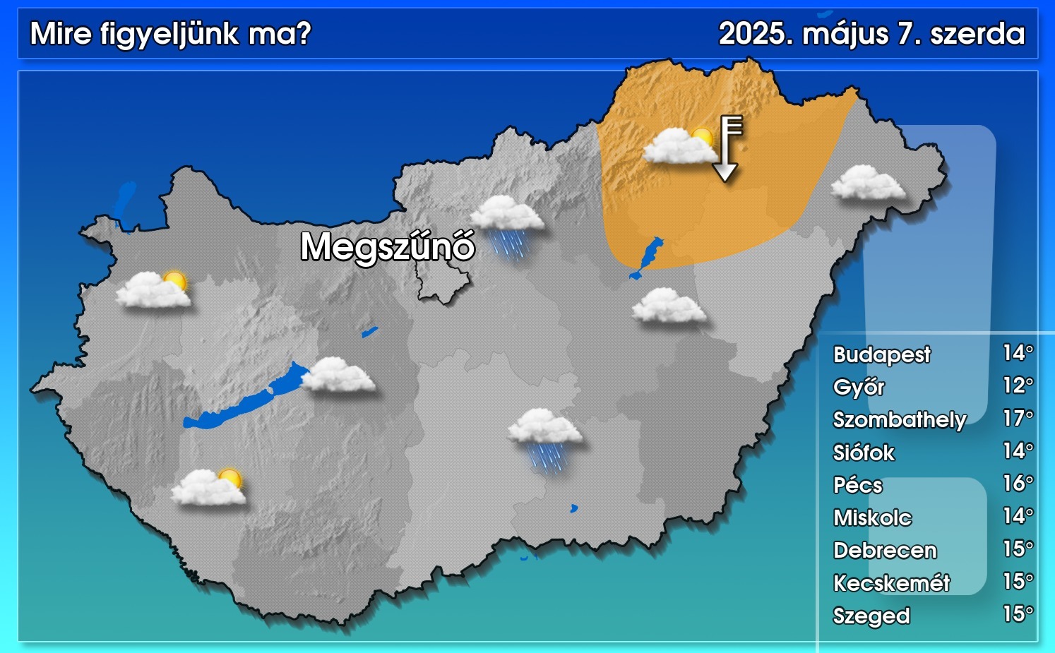 Ma általában erősen felhős vagy borult idő várható, de fokozatosan egyre kevesebb helyen várható eső, lassanként szűnik a csapadék. Szakadozottabb felhőzetre, ezáltal hosszabb-rövidebb napos periódusokra az északnyugati, nyugati, valamint északkeleti tájakon számíthatunk. Az északi, északkeleti szél többfelé megélénkül, az északkeleti megyékben meg is erősödik. A csúcshőmérséklet bőven a sokévi átlag alatt, mindössze 11 és 18 fok között alakul – közölte a HungaroMet NZrt.