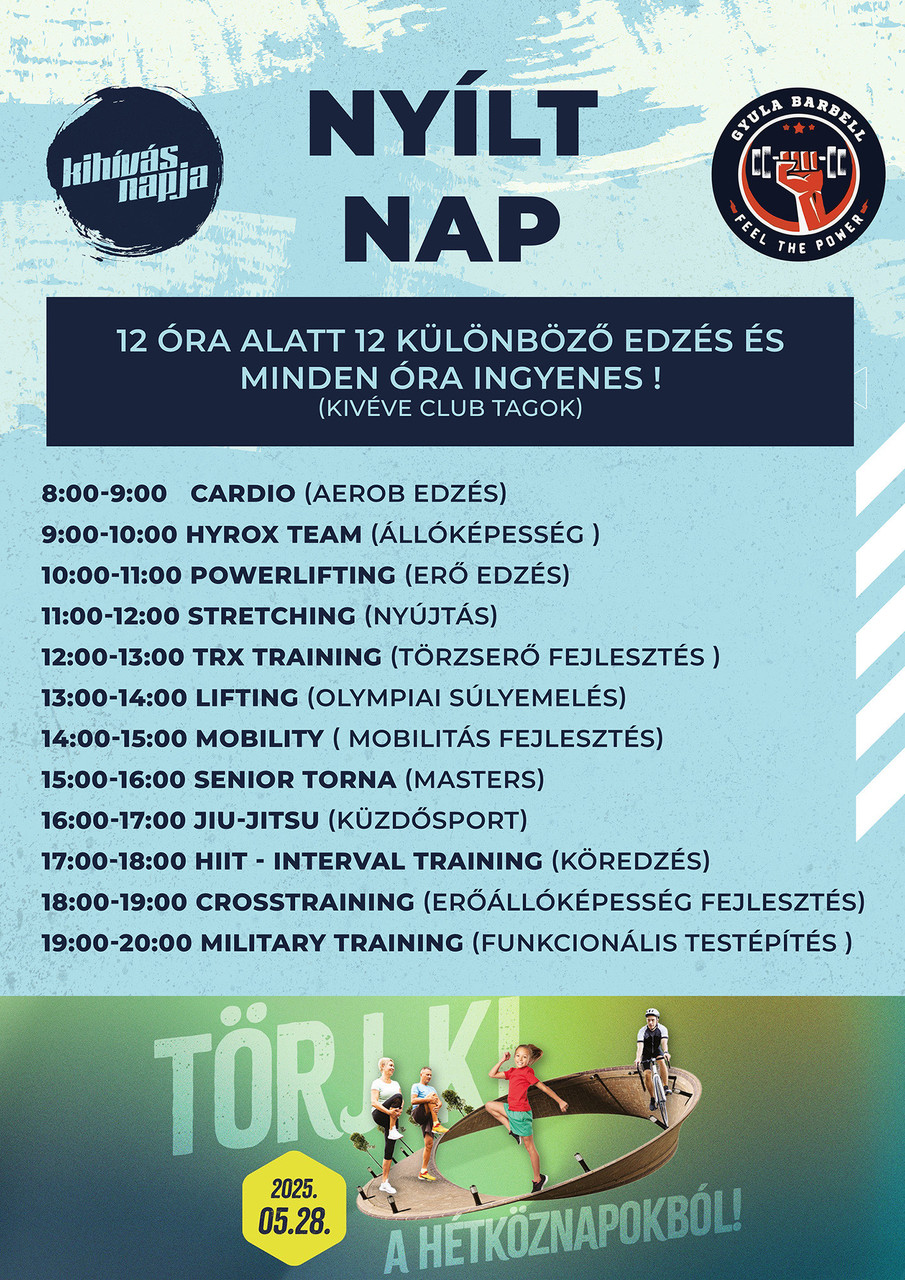 A Gyulai Barbell Sport Club Békés vármegyéből egyedüliként csatlakozik a kezdeményezéshez. 8 órától egészen este 19 óráig várják a sportolni vágyókat, többek között crosstraining, senior torna és mobility edzésekre is.