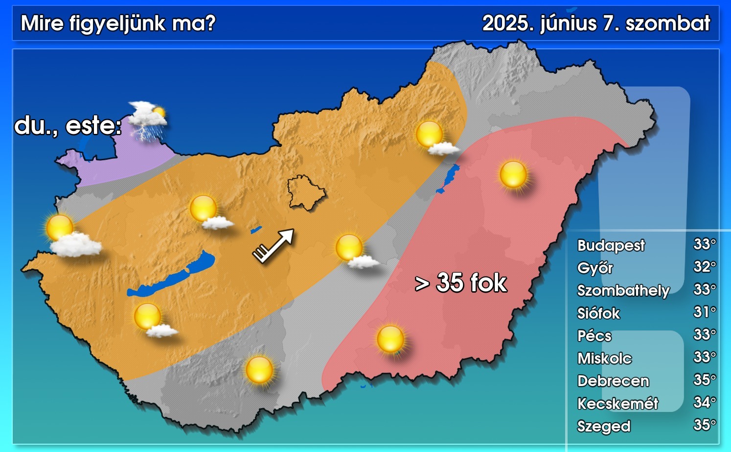 A legtöbb helyen napos idő lesz kevés felhővel, csapadék nélkül. Délután, estefelé az Alpok felett zivatarok alakulnak ki, amelyek ÉK felé mozognak, és súrolhatják hazánkat. Heves zivatarok kialakulására is van esély. Többfelé megerősödik a délnyugati szél, zivatarok környezetében viharos lökések is előfordulhatnak. A csúcshőmérséklet 30 és 36 fok között alakul, ami azt jelenti, hogy a melegrekord is megdőlhet.