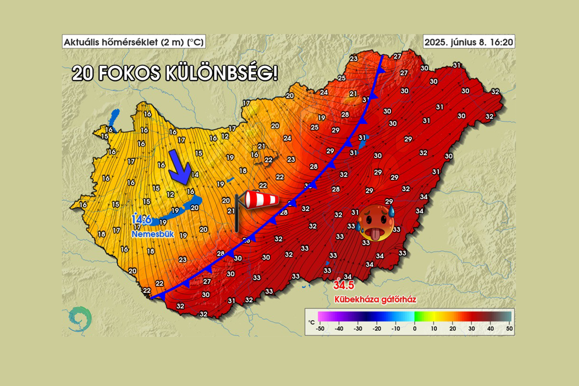 Ennek következtében – csaknem tizedre pontosan – 20 fokos hőmérsékleti kontraszt alakult ki az országban.