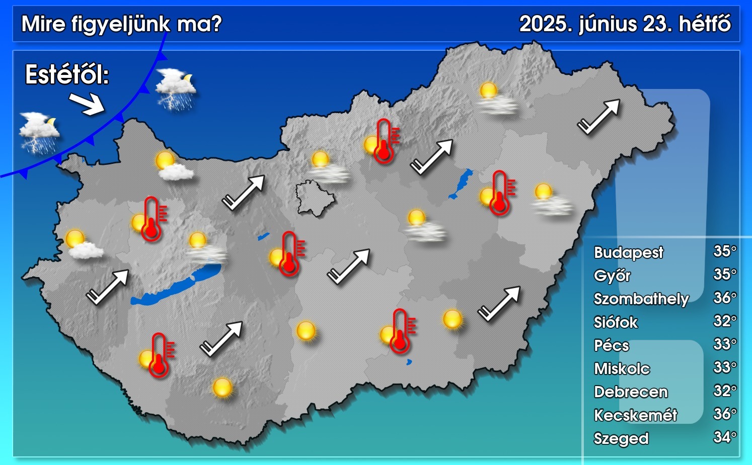 A nap nagyobb részében még szinte mindenütt derült vagy fátyolfelhős, csapadékmentes idő várható, nagy területen élénk, olykor erős délnyugati széllel, országos kánikulával – a csúcshőmérséklet 31 és 36 fok között valószínű. Késő délutántól, estétől azonban, egy érkező hidegfront hatására, főként az északi tájakon egyre többfelé befelhősödik az ég, a front vonulását pedig keddre virradó éjjel elsősorban arrafelé kísérhetik záporok, zivatarok, heves zivatar sem kizárt. Délebbre kevesebb felhő ígérkezik, a csapadék esélye is kisebb. A nappali órákban sokfelé élénk, néhol erős lesz a délnyugati szél, amely estétől egyre többfelé északnyugatira fordul. Zivatarok környezetében azonban átmenetileg viharos, sőt, néhol akár erősen viharos széllökések is előfordulhatnak – közölte a Hungaromet NZrt.