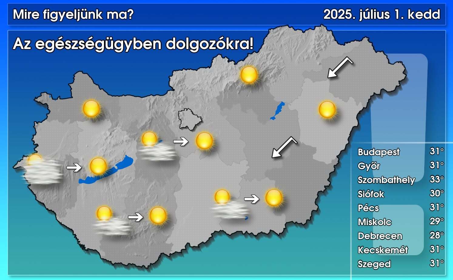 Hazánk délnyugati felén a reggeli, délelőtti órákban még fátyolfelhőzet szűrheti a napsütést, majd arrafelé is fokozatosan csökken a felhőzet, kiderül az ég. Másutt folytatódik a zavartalanul napos idő. Csapadék nem lesz, és az északkeleti szél is inkább már csak a Tiszántúlon élénkülhet meg. A héten ma lesz a „leghűvösebb”, általában 28 és 33 fok között várhatók a délutáni csúcsértékek, az északkeleti tájakon lehet ennél egy-két fokkal alacsonyabb a maximum.