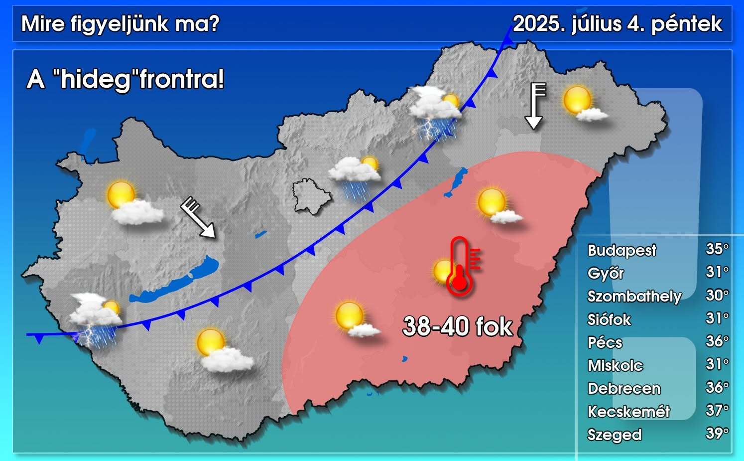 Ma már felhők is lesznek felettünk, de általában így is sok napsütés várható. A front mentén záporok, zivatarok kialakulhatnak, legnagyobb eséllyel a Dunántúl nyugati, délnyugati részein, valamint az Északi-középhegység és az Észak-Alföld térségében. A front előterében még magasra szökik a hőmérséklet, az Alföldön 38, 39 fok várható, de egy-egy helyen 40 fok is lehet. Az északnyugati, északi szél sokfelé megélénkül, sőt meg is erősödik.