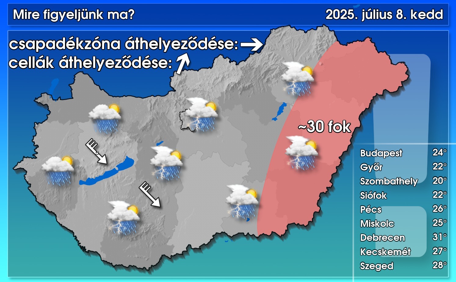 Délnyugat, nyugat felől egyre erőteljesebbé válik a felhőképződés, és a tegnapihoz hasonló módon ma is egyre nagyobb számban – előbb a nyugati, majd a keleti tájakon – alakulnak ki záporok, zivatarok. A keleti, délkeleti országrészben heves zivatarok is előfordulhatnak, amelyeket jégeső, viharos szél, felhőszakadás kísérhet, sőt helyenként károkozó szélroham sem kizárt. Az egyre inkább északnyugatira forduló szél elsősorban a Dunántúlon erősödhet meg. A csúcsérték ma már csak a Tiszántúlon érheti el, haladhatja meg a 30 fokot, máshol nagyrészt 22 és 30 fok közötti értékek lesznek jellemzőek, míg az akár tartósan borult nyugati határvidéken ennél hűvösebb maradhat az idő – közölte a Hungaromet NZrt.