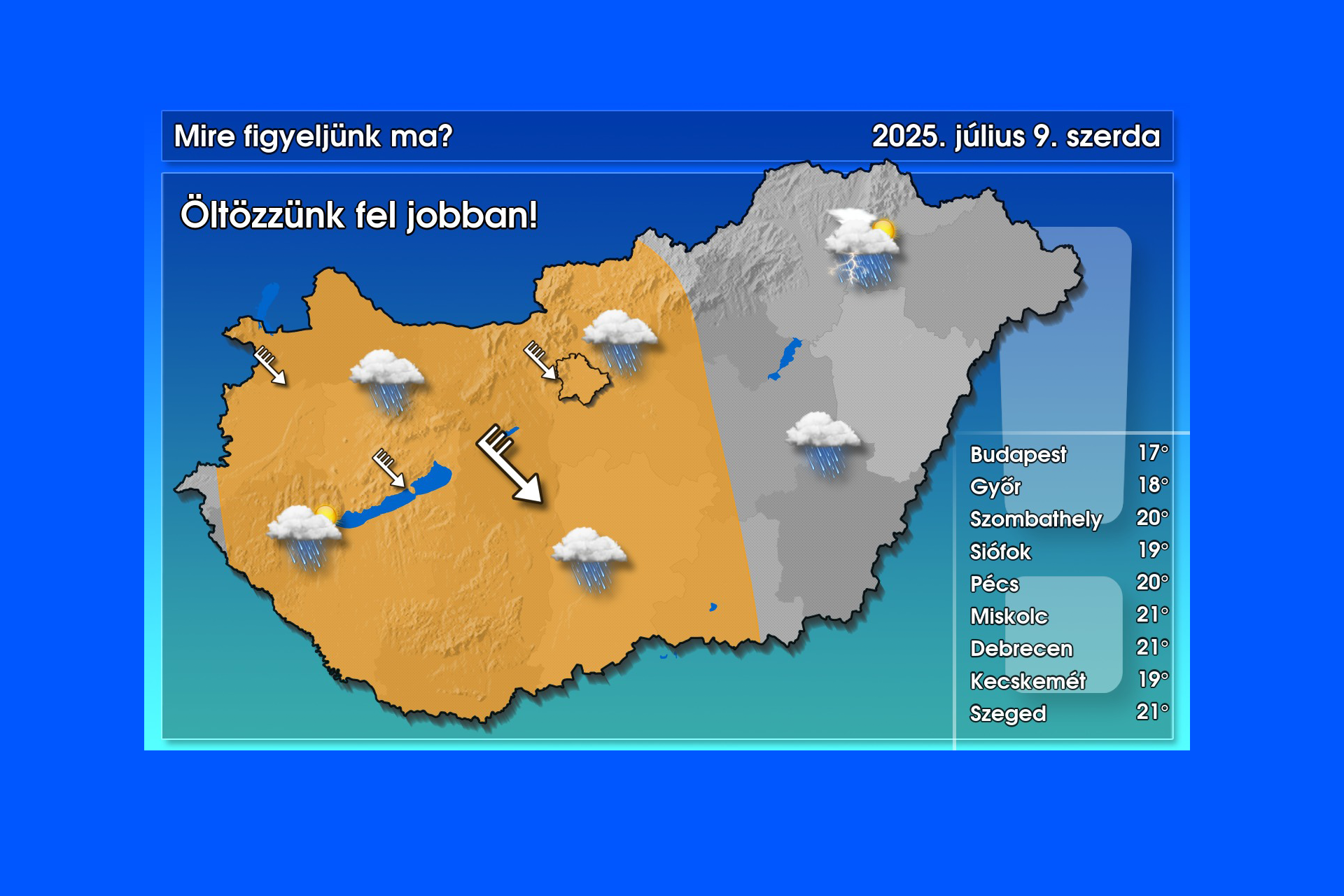 A meleg levegő kiszorult hazánkból, ezzel együtt a heves zivatarok kialakulásának veszélye is megszűnt. Többnyire felhős lesz ma az ég, időszakos eső, záporeső többfelé előfordulhat az országban, északkeleten még villámlás, dörgés sem zárható ki. A hőmérséklet csúcsértéke a legtöbb helyen mindössze 16 és 21 fok között valószínű, de az erős, néhol viharos északnyugati szélben ezt kevesebbnek érezhetjük – írta ma reggel közösségi oldalán a HungaroMet.
