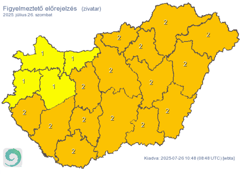 Másodfokú riasztást adtak ki Békés vármegyére zivatar és felhőszakadás miatt – jelent meg a HungaroMet NZrt. oldalán.