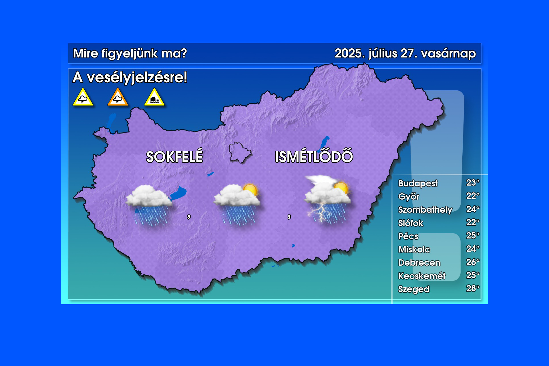 Légörvény alakítja időjárásunkat, így jobbára sok felhőre számíthatunk, és sokfelé várható ismétlődő eső, zápor, zivatar. Intenzívebb zivatarok továbbra is előfordulhatnak főként felhőszakadás kíséretében, de elsősorban az ország keleti tájain jégeső, erősen viharos szélrohamok is társulhatnak hozzájuk. A csapadékhajlam tartós csökkenése késő délutántól, estétől kezdődik délnyugat felől. A hőmérséklet a legtöbb helyen már 30 fok alatt marad (jellemzően 21 és 28 fok között alakulhat), a hőérzeten viszont leginkább a Dunántúlon ronthat az arrafelé zivataroktól függetlenül is többfelé megélénkülő, megerősödő északi, északnyugati szél. A veszélyjelzésnek (különösen a riasztásoknak) ilyen időjárási helyzetben kitüntetett szerepe van, fokozottan ajánlott gyakran követni! – írta közösségi oldalán ma reggel a HungaroMet.hu.
