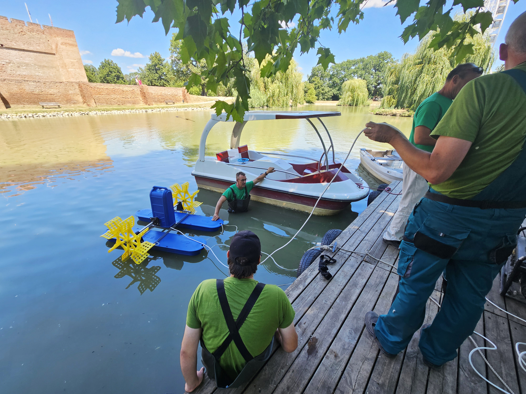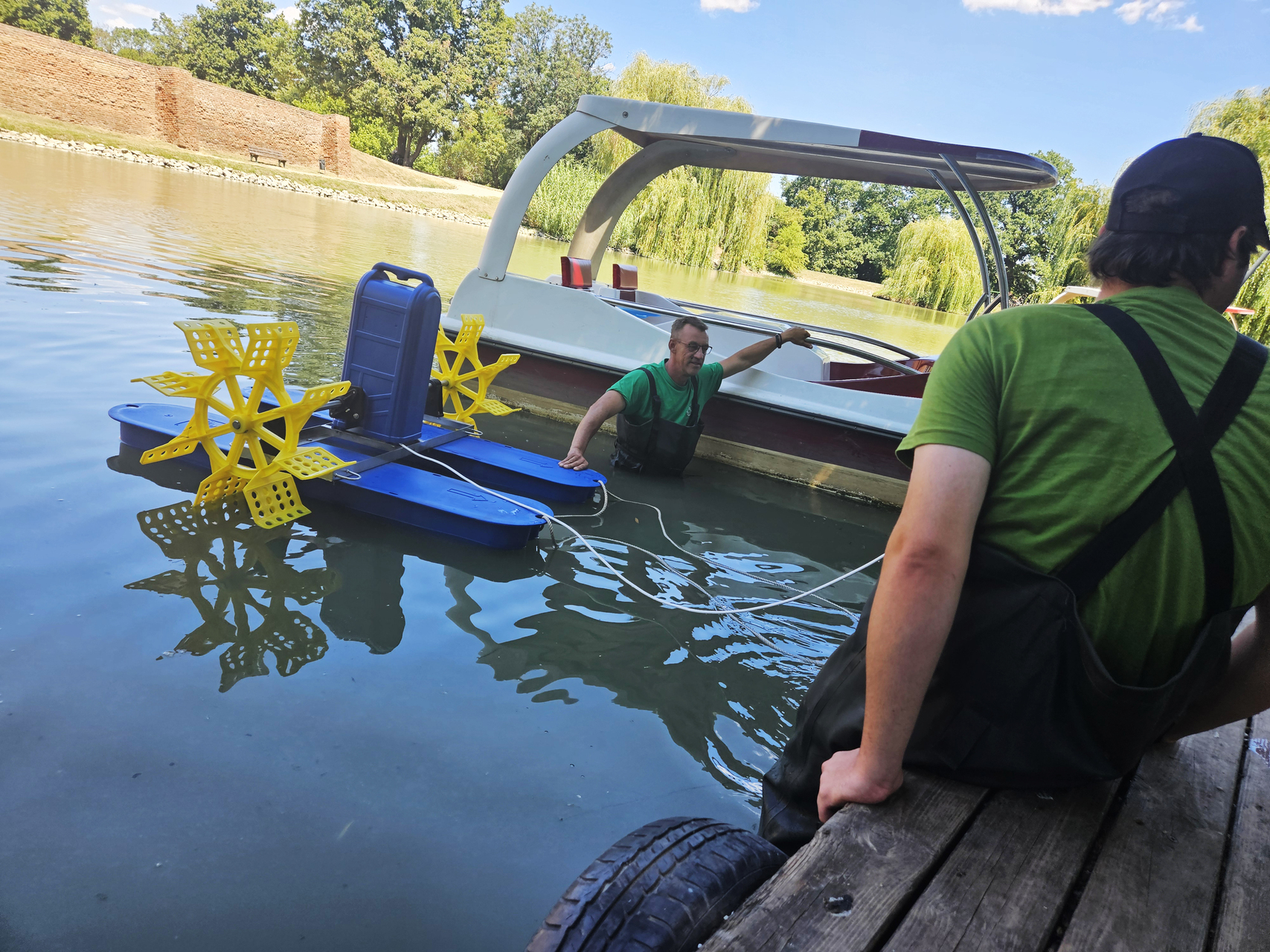 Lapátkerekes levegőztetővel biztosítja a Gyulai Közüzemi NKft., hogy a nagy melegben is megfelelő legyen a vár melletti csónakázótó oldottoxigén-tartalma.
