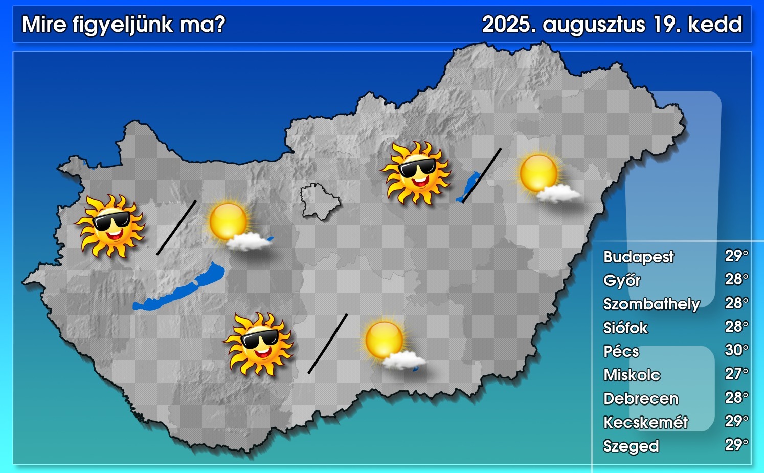 Folytatódik a napos, gomolyfelhős időjárás. A gomolyok délután szétterülve helyenként felhősebb periódusokat is okozhatnak, de csapadék nem várható belőlük. A légmozgás csak néhol élénkülhet meg. A csúcsérték 27 és 32 fok között alakul.