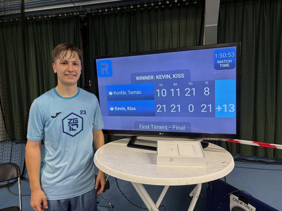 A first timer kategóriában két francia, egy holland és egy lengyel ellenfélen át vezetett az út, ahol végül egy másik magyarral nézett szembe. Asztaliteniszben és tollasban Kiss Kevin nyert, fallabdában az ellenfele, Konfár Tamás győzött, így még semmi sem dőlt. Az utolsó fordulóban teniszben mérték össze az erejüket, amelyet a gyulai fiatal nyert meg, így elhódította a világbajnoki címet is.