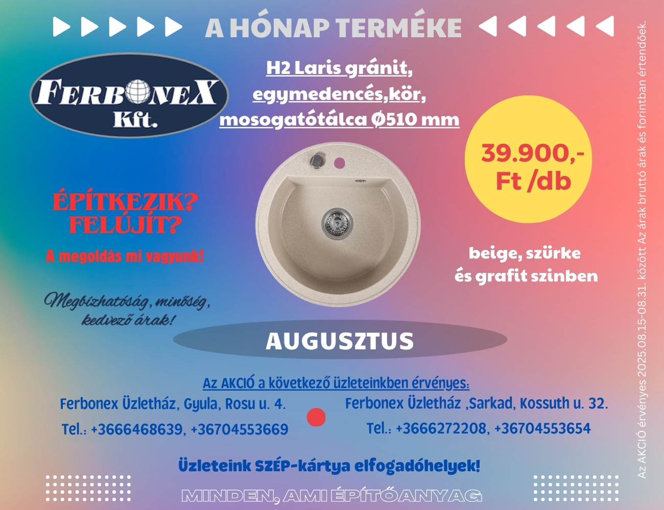 Augusztusban a H2 Laris gránit, egymedencés, kör alakú mosogatótálca kapható akciósan a Ferbonexben