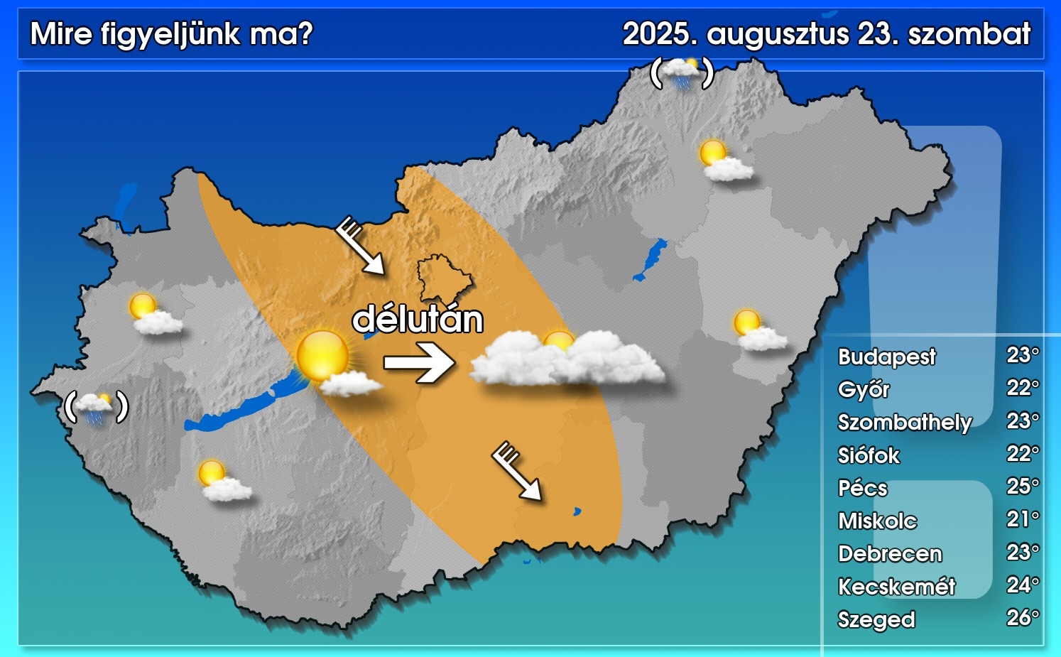 A legtöbb helyen napos idővel indul a nap, de délutánra megsokasodnak a fejünk felett a gomolyfelhők , amelyek szétterülve hosszabb ideig is takarhatják a napot. Csapadék az ország túlnyomó részén nem várható, azonban a nyugati és az északkeleti határvidéknél nem kizárt egy-egy zápor. Az északnyugati szél ismét megélénkül, elsősorban a színezett sávban helyenként meg is erősödik. Délután 20, 26 fokot mérhetünk a legmelegebb órákban.