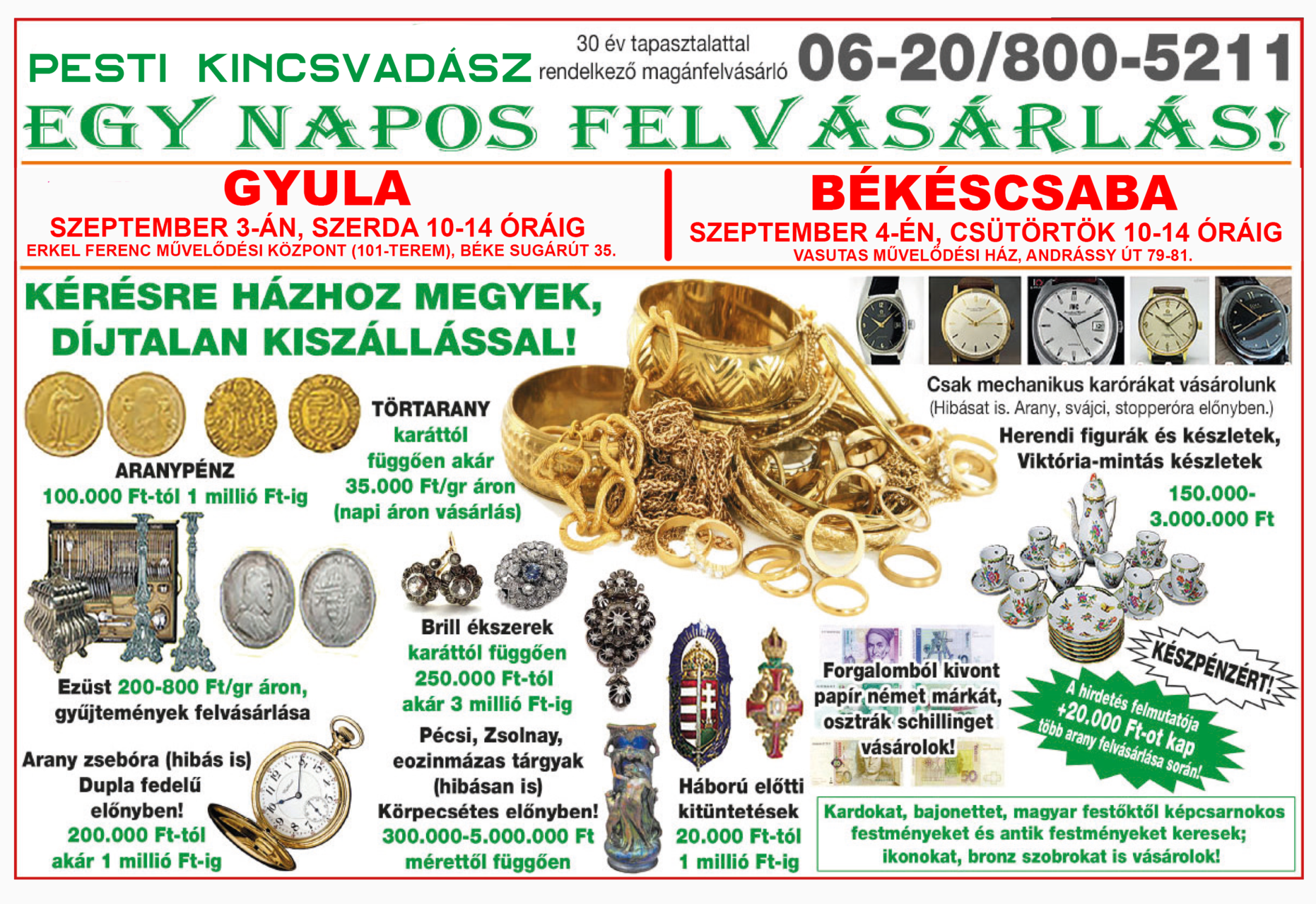 Harmincéves tapasztalattal rendelkező magánfelvásárló egynapos felvásárlást tart szeptember 3-án, szerdán 10–14 óráig az Erkel Ferenc Művelődési Központ 101-es termében. Kérésre házhoz is megy díjtalan kiszállással. Telefonszám: 06-20/800-5211.