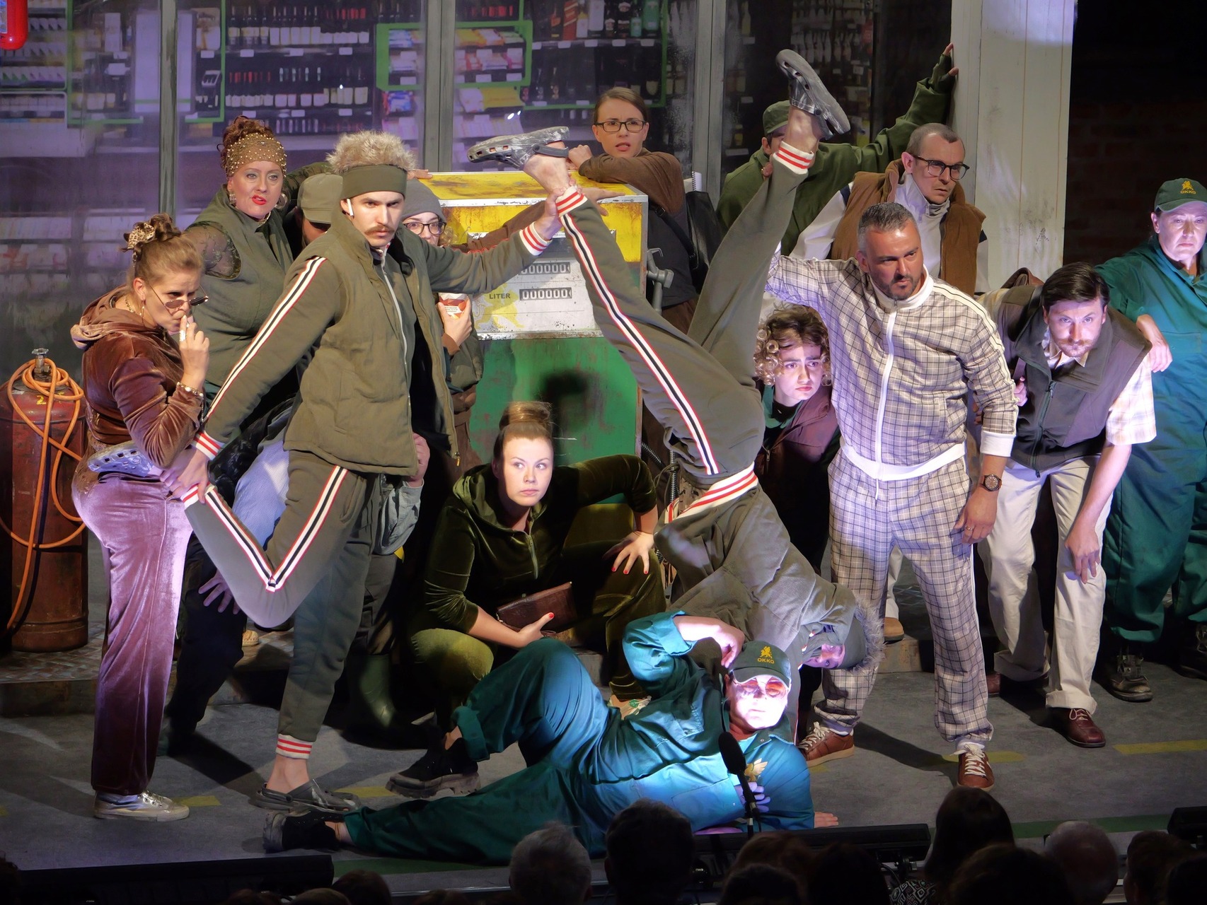 A színpadon teljes a káosz. Hol tasakos levest szórnak szét, hol vízzel fröcskölik a közel ülőket (utoljára ilyen élményem A Pál utcai fiúk fürdetős jeleneteinél volt a Vígszínház első soraiban), hol karaokéznak, hol ismert musicalek (Jézus Krisztus szupersztár, Hamilton, Macskák) dalaira táncolják körbe a benzinkút díszletet, afféle átkötésként.