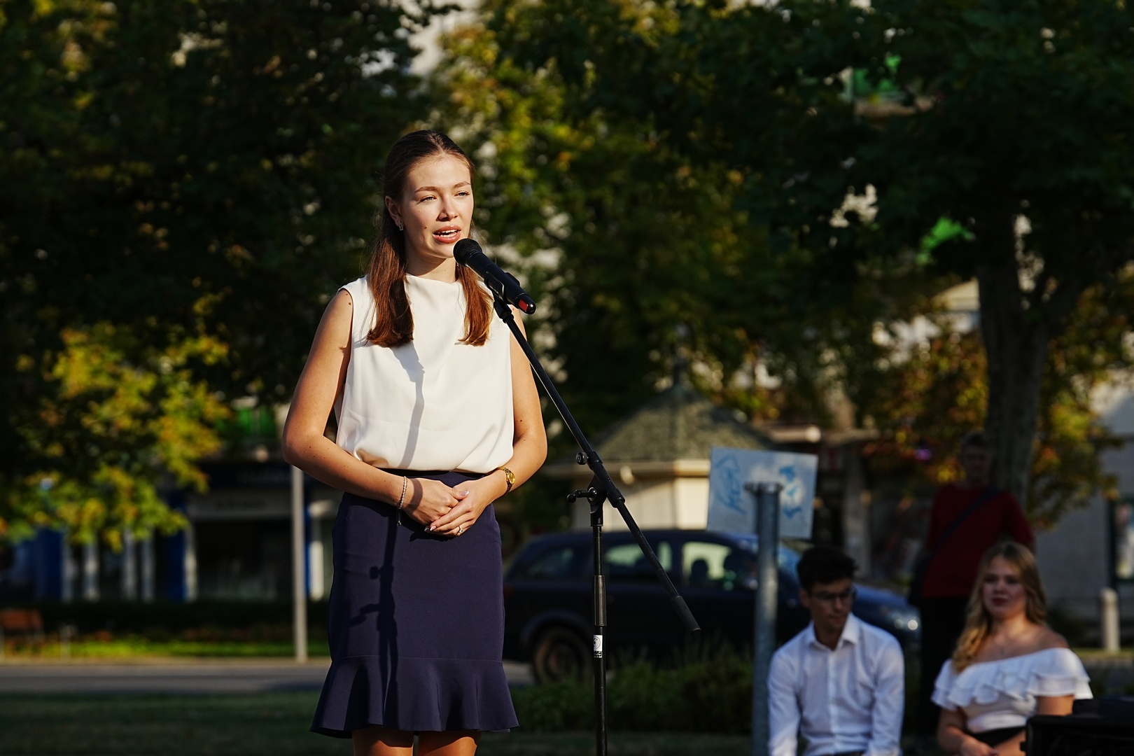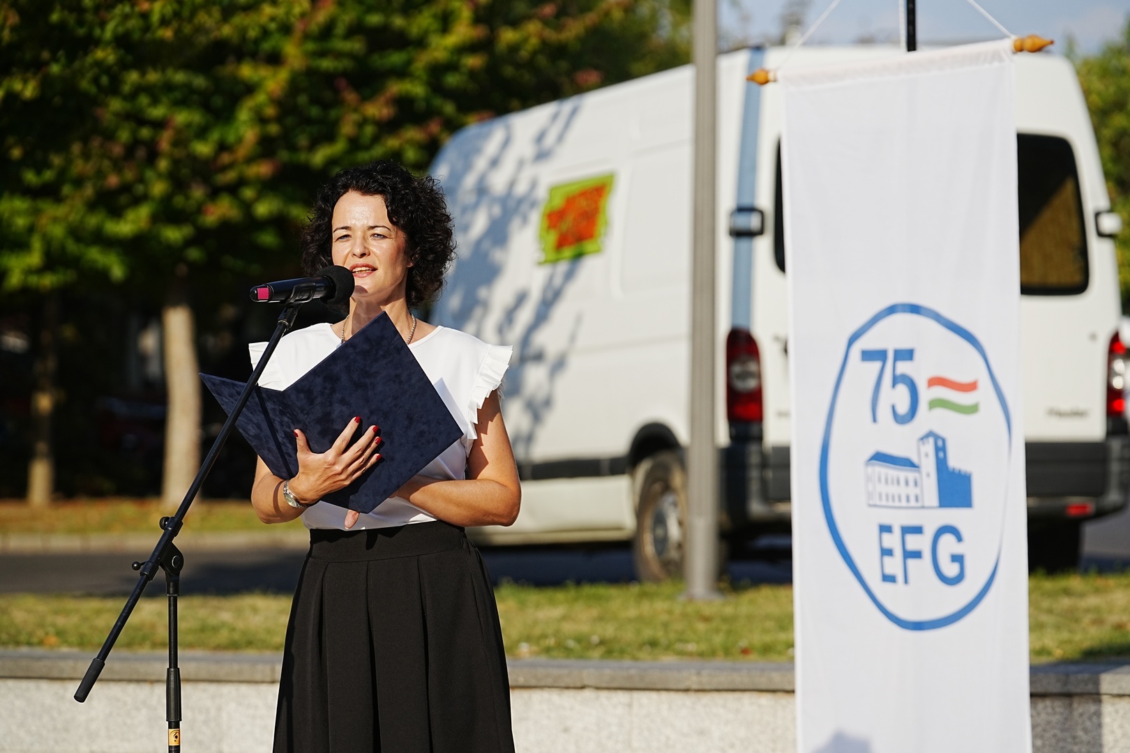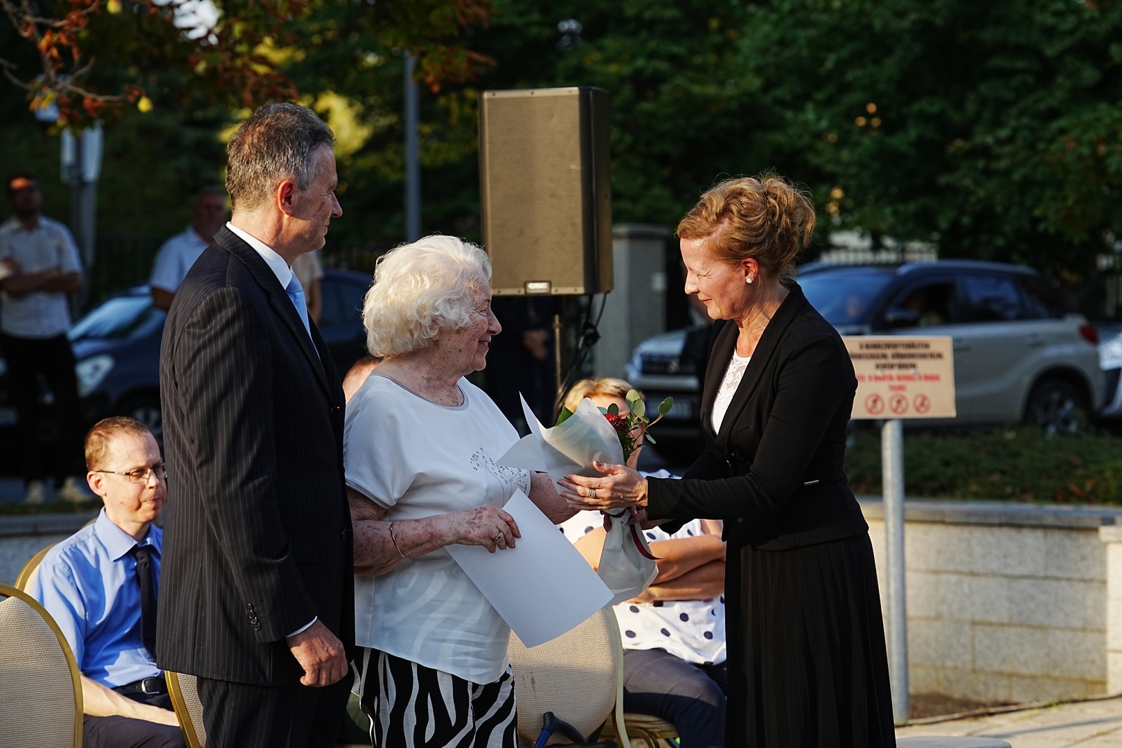 Az ünnepségen elismerték Kallós Esztert, aki az iskola diákönkormányzatának pályázatára jelentkezve tervezett egy zászlót az évfordulóra.