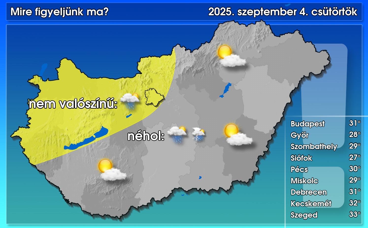 A pára, köd feloszlását követően napos időre van kilátás általában kevés fátyol- és gomolyfelhő mellett, sőt a színezett részen többnyire derült idő várható, csapadék nélkül. Máshol is csupán néhol lehet zápor, esetleg egy-egy zivatar. Marad a nyárias idő, 27, 34 fok között mérhetjük a maximumokat, keleten délkeleten lesz a legmelegebb.