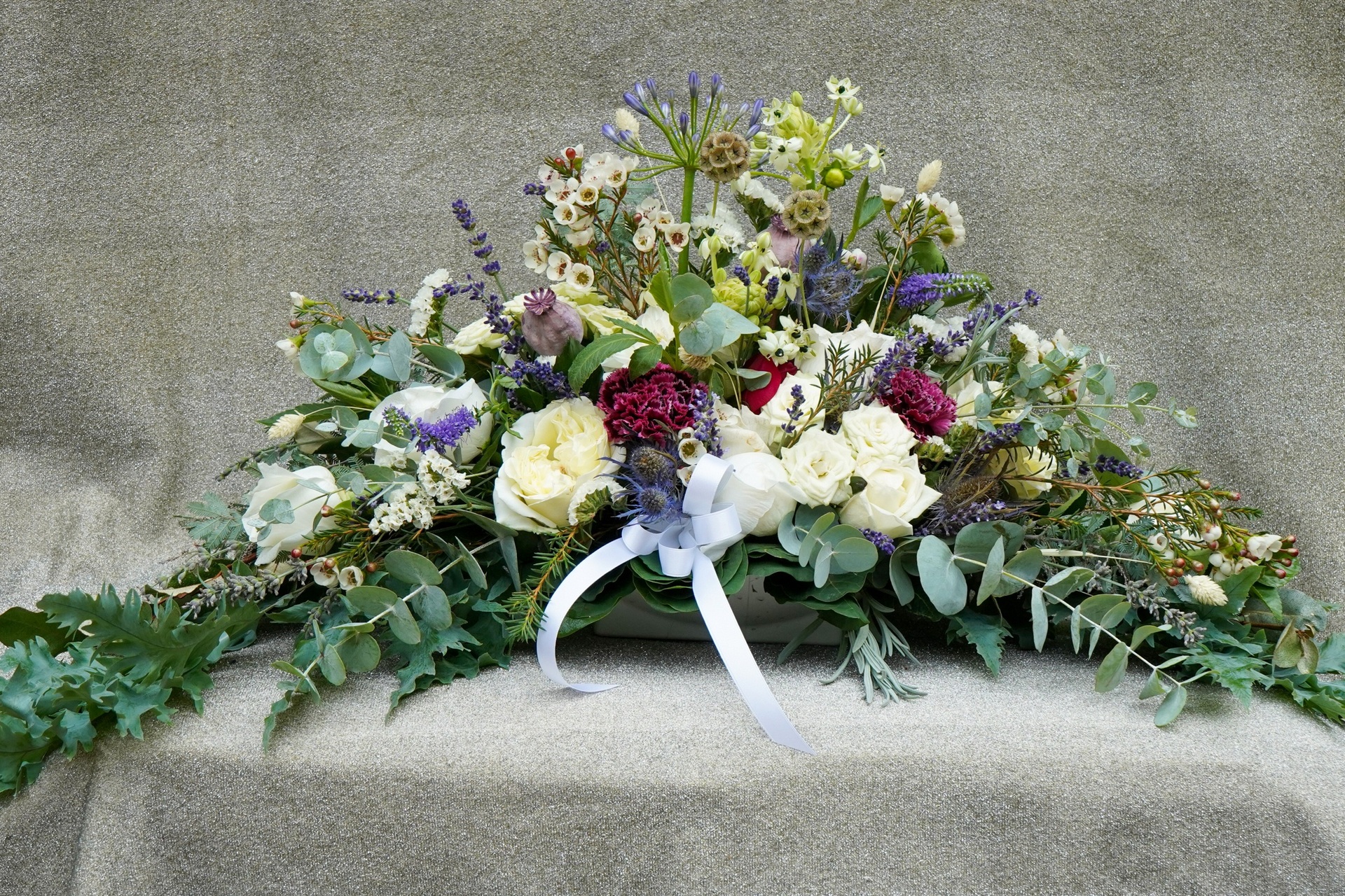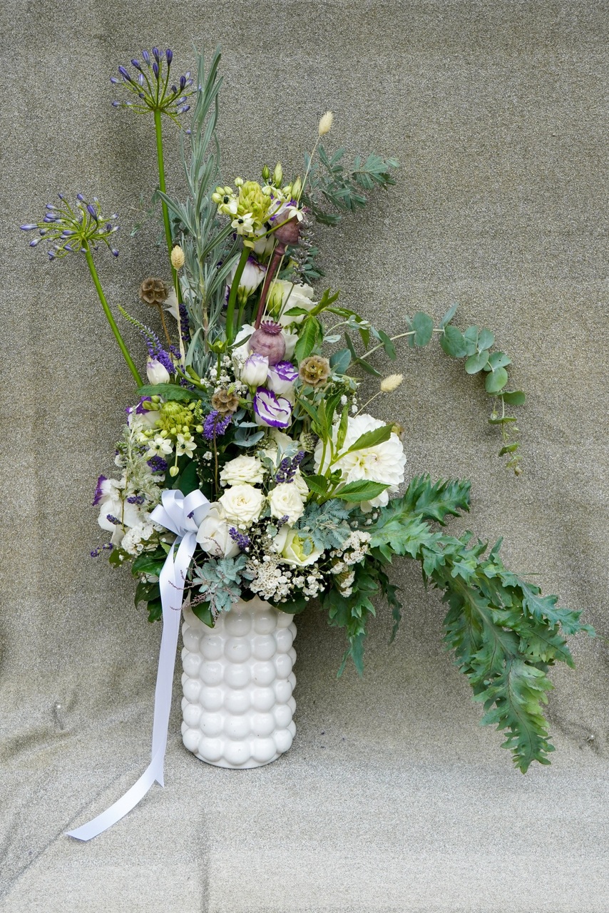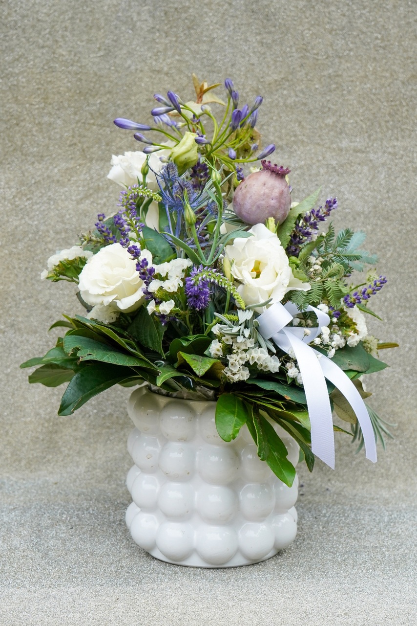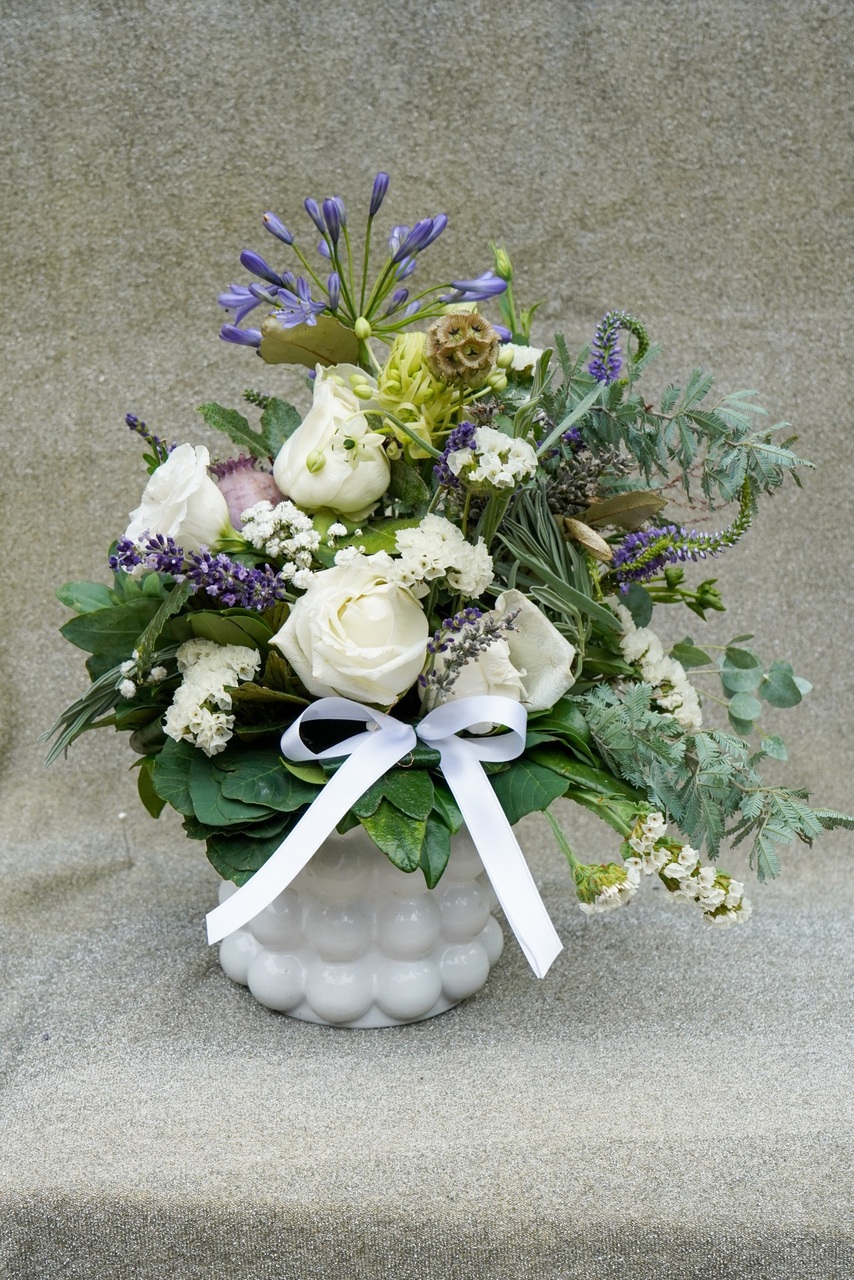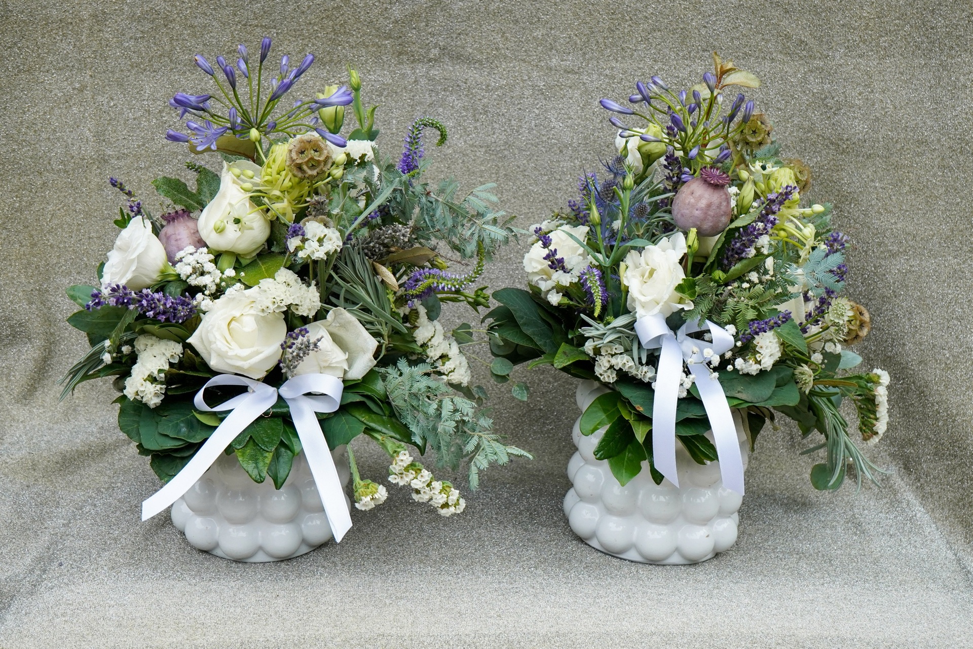 valamint egyszerű kis csokrok láthatók lila és fehér virágokkal, a kompozíciókat egy esküvőre rendelték tőlünk – fejtette ki Góg Tünde üzletvezető.
