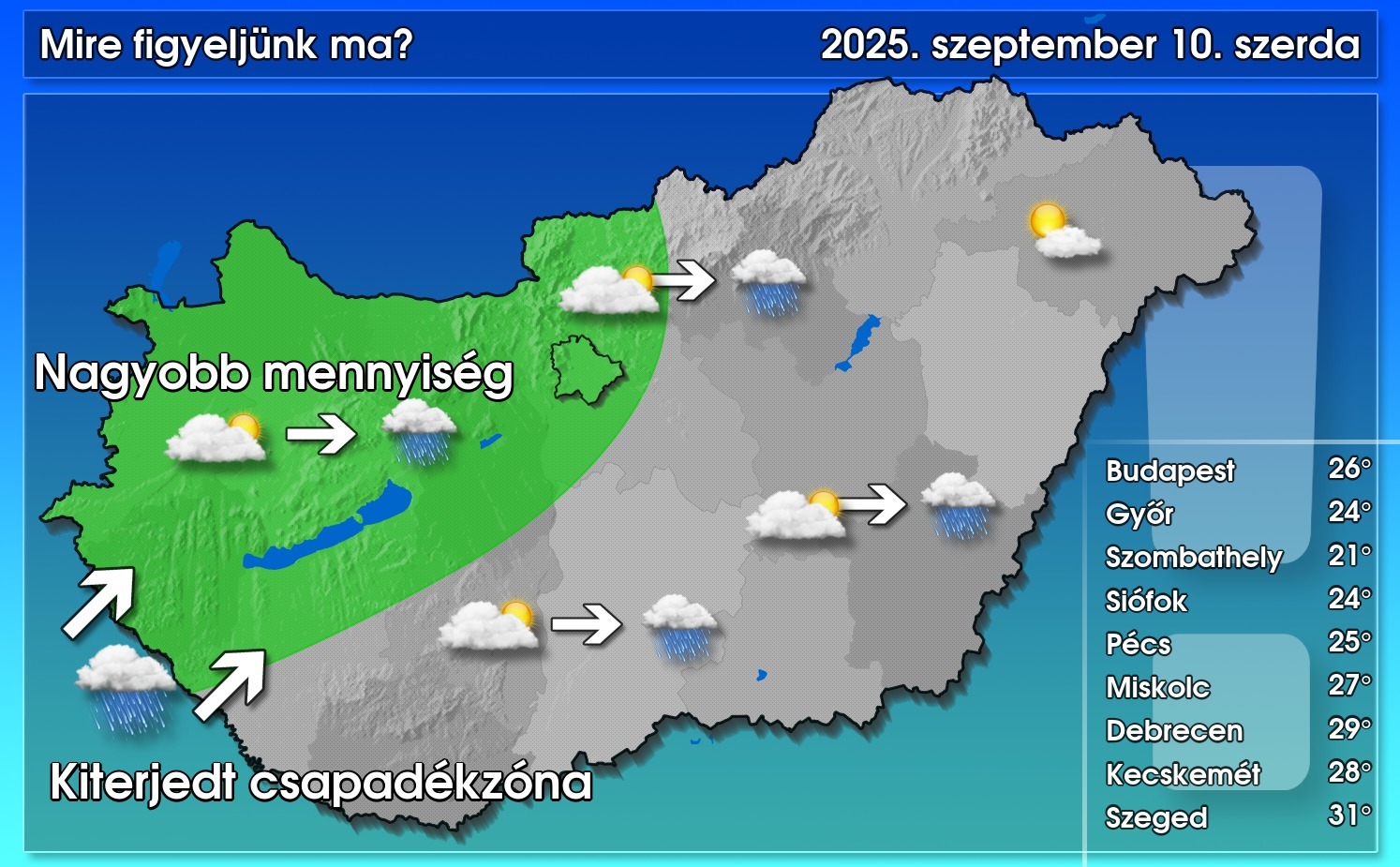 Ahol napközben átmenetileg kissé szakadozottabbá, vékonyabbá válhat a felhőzet, ott a közeledő ciklon miatt újból záródik a felhőtakaró. Nagyjából a déli óráktól délnyugat felől kiterjedt csapadék érkezik, egyre nagyobb területen valószínű eső, zápor, néhol zivatar is előfordulhat. Nagyobb mennyiség az ország nyugati részein valószínű. A délkeleti szél mérsékelt, élénk lesz. A hőmérséklet általában 25 és 31 fok között valószínű, de a nyugati megyékben néhol lesznek helyek, ahol csak 20 és 24 fok között alakul – közölte a HungaroMet NZrt.