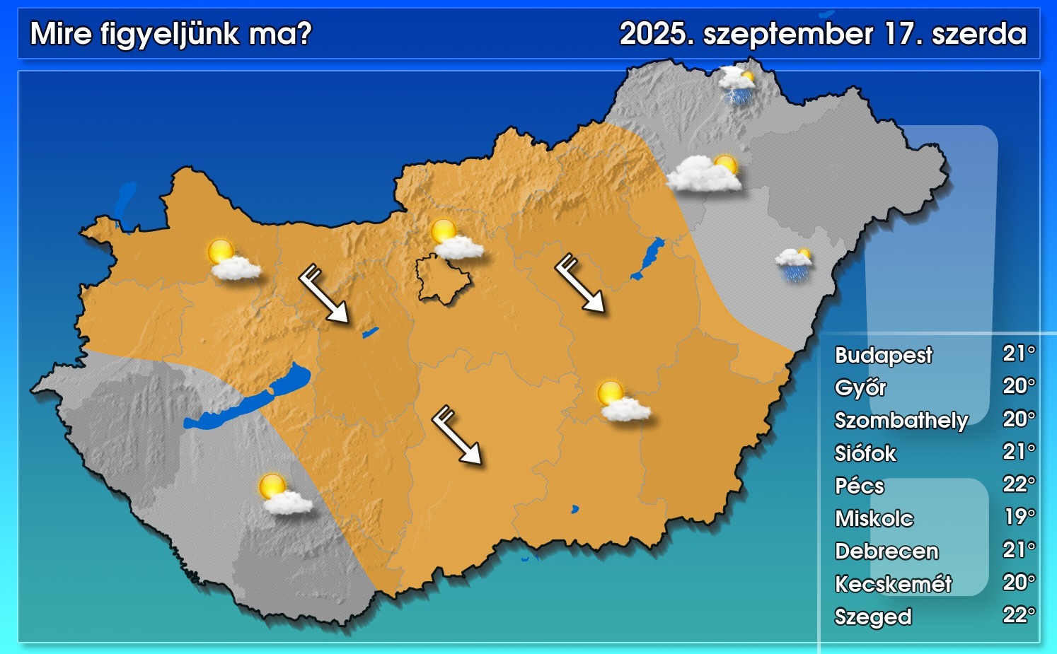 Tipikus száraz hátoldali helyzetre számíthatunk a tegnapi hidegfrontot követően. Az ország nagy részén gomolyfelhős, napos, csapadékmentes idő valószínű, de északkeleti, keleti vármegyéinkben a képződő gomolyfelhőkből előfordulhat zápor, esetleg zivatar is lehet. Az északnyugati szél szinte országszerte megélénkül, a színezett területen napközben meg is erősödik, de késő délutántól már mérséklődik a légmozgás. A csúcsérték többnyire 20, 21 fok közelében alakul – közölte a HungaroMet NZrt.