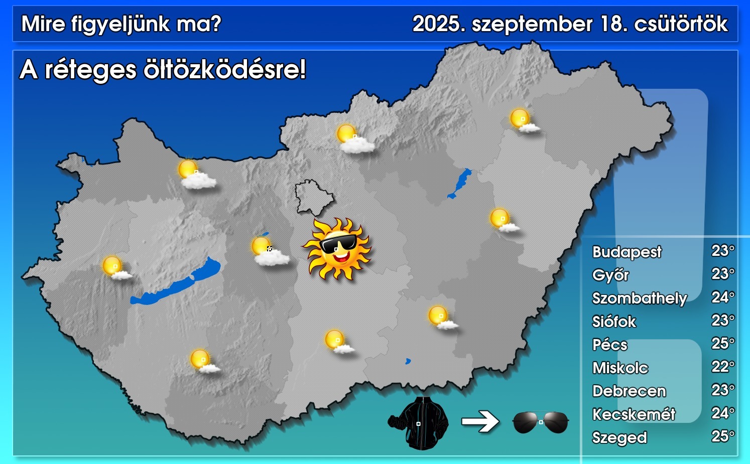 Érdemes lehet a fázósabbaknak akár egy kabátot is felkapni reggel munkába vagy suliba menet, ugyanis az ország nagy részén csípős reggelre ébredtünk. De a ma várható sok napsütés hatására gyorsan melegszik az idő, a csúcsérték délután 21 és 26 fok között várható időnként megélénkülő nyugatias szél mellett. így ekkor már inkább a napszemüvegekre lehet szükség.