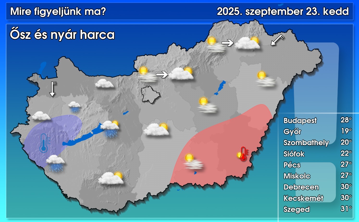 Hazánk nyugati, északnyugati harmadára ma megérkezik az ősz, ott ugyanis nagyrészt felhős idő várható, és eső, illetve zápor is előfordulhat. Ott északias lesz a szél és a hőmérséklet 16, 23 fok között alakul. Ezzel szemben kelet, délkelet felé haladva inkább csak fátyolfelhők lesznek az égen, és teljesen csapadékmentes idő várható, amely mellett 24 és 32 fok közé emelkedik a hőmérséklet, délkeleten lesz a legmelegebb.