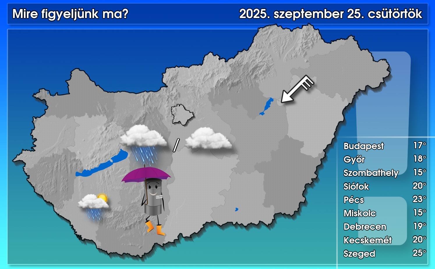Erősen felhős vagy borult lesz az ég, és több alkalommal is lehet időszakos esőre, záporra számítani. DNY-on szakadozottá válhat a felhőtakaró. Az északkeleti szél főként a nap első felében az Észak-Alföldön időnként megerősödik, később mérséklődik a légmozgás. Északon 14, 19, délen 20, 25 fok lesz a maximum-hőmérséklet.