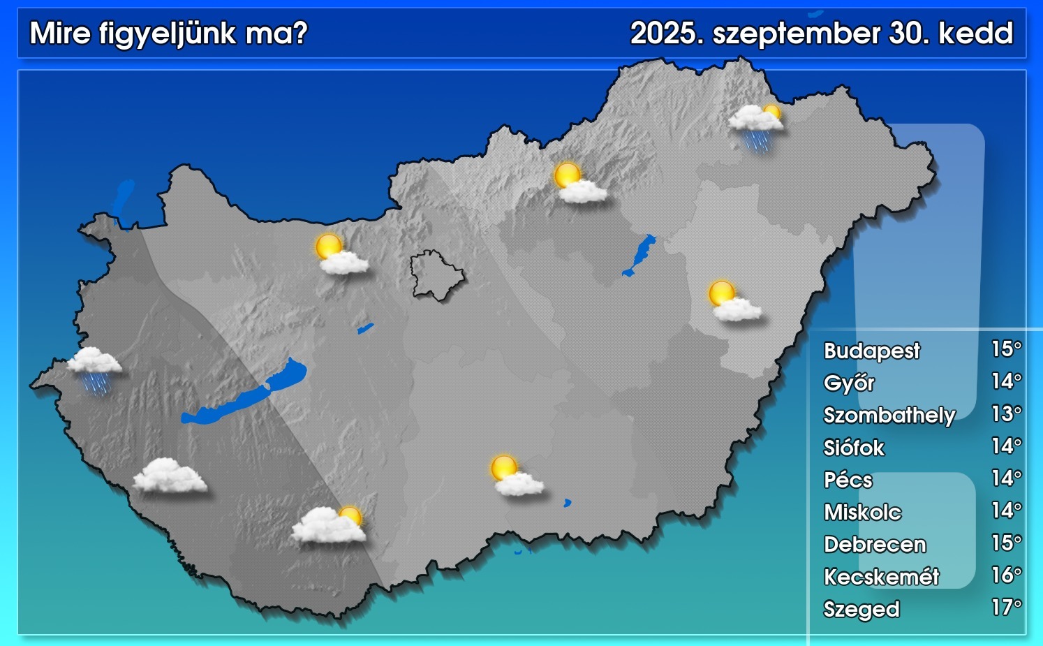 Északkelet felé haladva egyre több lesz a napsütés: a Dunántúl délnyugati, nyugati részén szinte egész nap erősen felhős, illetve borult időre van kilátás, a középső tájakon csak átmenetileg növekedhet meg erősebben a felhőzet, északkeleten és az Észak-Alföldön gomolyfelhős, napos időben lesz részünk. A gomolyokból kevés helyen zápor, zivatar, míg az összefüggő, vastagabb felhőzetből csepergő, szemerkélő eső előfordulhat. Csak néhol élénkül meg az északi, északkeleti szél. A csúcsérték 12 és 17 fok között valószínű.
