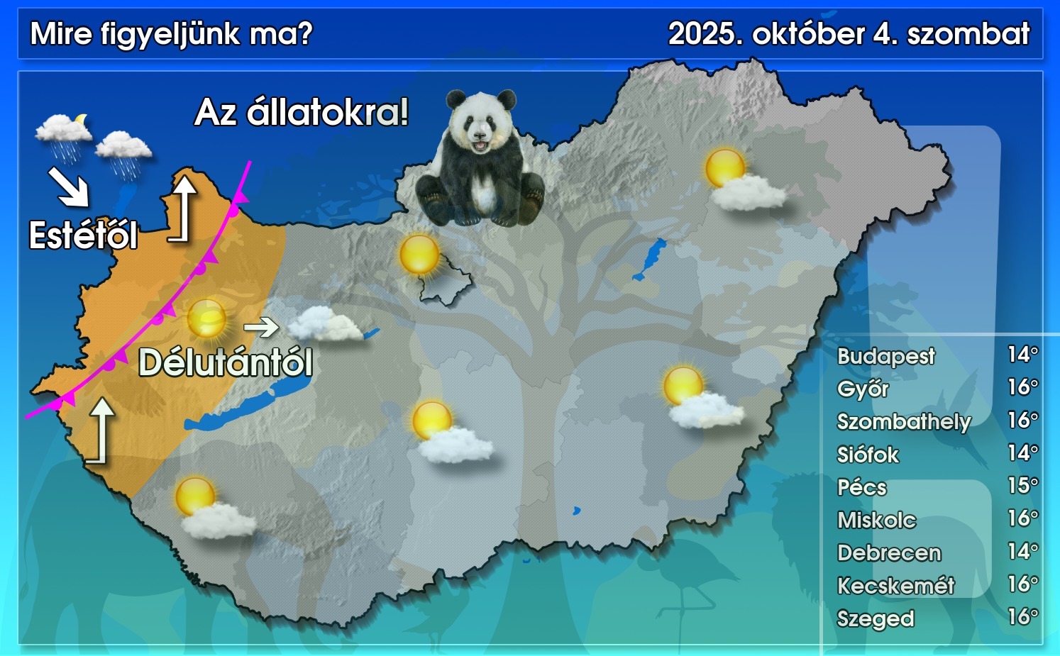 A nap első felében napos, gyengén felhős időre számíthatunk, délutántól azonban az északnyugat felől érkező front előterében felhőssé válik az ég. Az esti órákhoz közeledve növekszik majd meg a csapadékhajlam. A hőmérséklet a csípős hajnal után viszonylag gyorsan melegszik, de még mindig kissé a sokévi átlag alatt alakul. A délies szél elsősorban a sárgával jelölt területen élénkül meg.