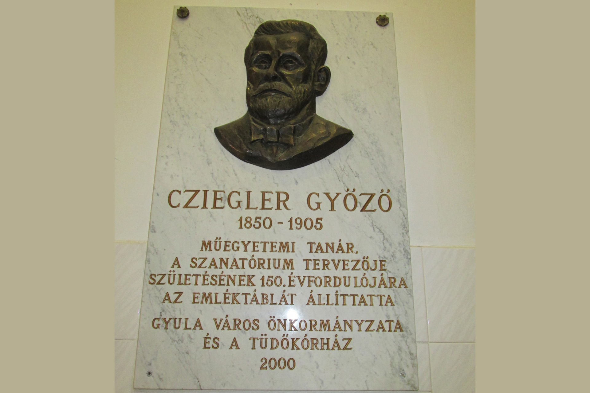 25 évvel ezelőtt, 2000. október 12-én Cziegler Győző emléktáblát avattak fel a tüdőkórházban. Beszédet mondott dr. Vincze Árpád igazgató-főorvos, D. Nagy András helytörténész. Az emléktáblát Bognár Levente, Arad város polgármestere leplezte le. A márvány emléktáblát Kiss László készítette, és a város önkormányzata, valamint a tüdőkórház állíttatta fel.